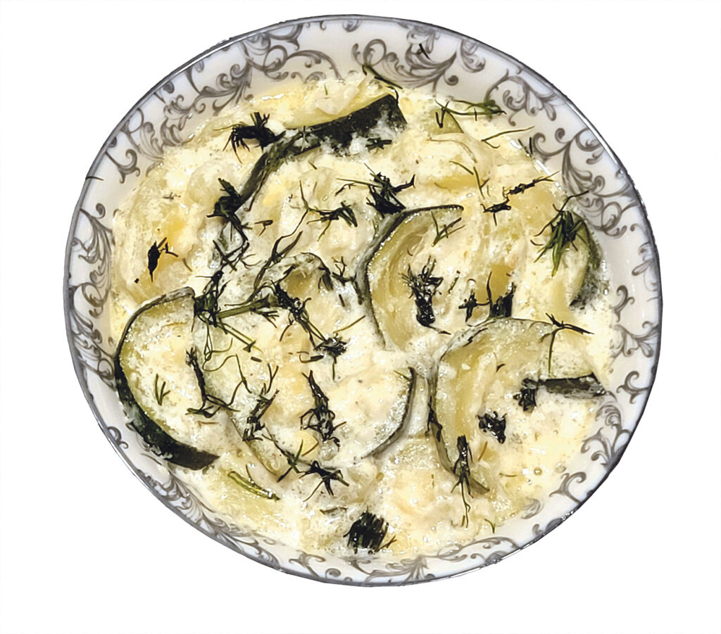 Skābo krējumu mazliet atšķaidīju ar karstu ūdeni, pielēju kabačiem pannā, piekaisīju sāli un piparus un sautēju apmēram piecas minūtes. Visbeidzot piemaisīju ķiplokus un zaļumus un pasautēju visu kopā vēl dažas minūtes.