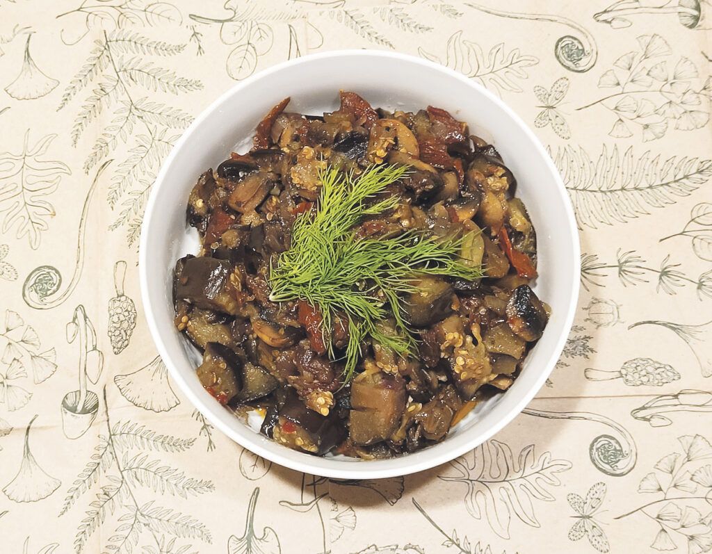 Pannā ar eļļu – to pielēju no saulē kaltēto tomātu burciņas – vispirms apmaisot apcepu sēnes kopā ar sīpoliem minūtes 5 – 7, arī multivārāmajā katlā cepšanas režīmā būtu vajadzīgs tikpat ilgs laiks. Pēc tam pieliku baklažānu gabaliņus, pielēju novārītu karstu ūdeni, pievienoju smalkāk sagrieztus saulē kaltētos tomātus, kā arī sāli un kaltēto Vidusjūras garšaugu maisījumu. Visu labi sajaucu un zem vāka, ik pa laikam apmaisot, sautēju līdz gatavībai. Multivārāmajā katlā sautēšanas režīmā ēdiens būtu jāgatavo 45 minūtes, taču pannā uz plīts to paveicu ātrāk.