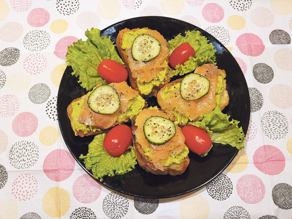 Avokado pārgriezu uz pusēm un izņēmu kauliņu. Mīkstumu nomizoju un sablendēju viendabīgā masā kopā ar ķiploka daiviņu, citrona sulu un sāli pēc garšas. To pārsmērēju maizes šķēlītēm, tad tās pārklāju ar mazsālīta laša strēmelītēm un rotāju ar svaiga gurķa ripiņām. Ātri, veselīgi un gardi!
