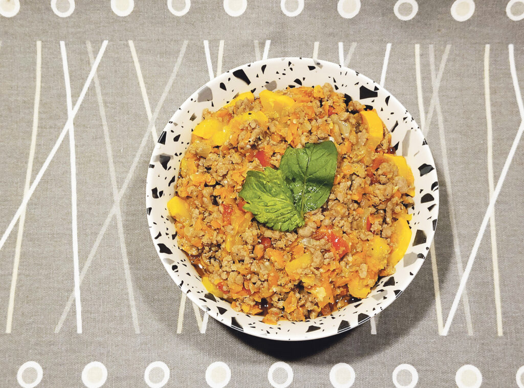 Uzkarsētā eļļā apcepu sagrieztus sīpolus un sarīvētus burkānus. Kad tie jau bija mīksti, pievienoju malto gaļu, piekaisīju sāli un piparus un apmaisot cepu vairākas minūtes, līdz gaļa kļuva gaiša. Pēc tam pieliku ceturtdaļšķēlītēs sagrieztus kabačus (jaunos varam pat nemizot) un visu cepu vēl apmēram septiņas minūtes. Tad pievienoju arī smalki sagrieztus svaigus tomātus, spiedē sasmalcinātus ķiplokus un Provansas garšaugu maisījumu, apjaucu, uzliku pannai vāku un uz vidējas uguns sautēju visu vēl vismaz desmit minūtes līdz gatavībai.