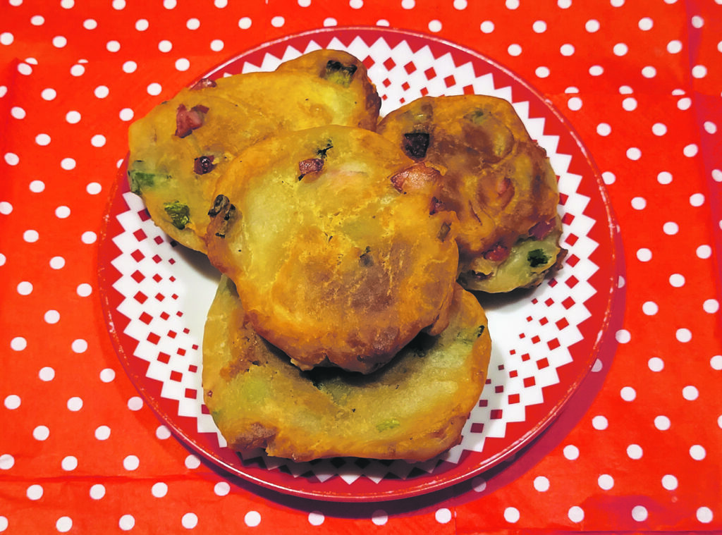 Iepriekš gan būtu jāizvāra divas olas, taču to nebiju paveikusi, tādēļ šoreiz izlīdzējos ar ledusskapī atlikušo gabaliņu cāļa desas, kuras sastāvā ir arī vārītas olas, – to sagriezu nelielos kubiņos. Sagriezu arī sīpolu lociņus. Šo pildījumu piejaucu mīklai, piekaisot vēl mazliet sāls un piparu.