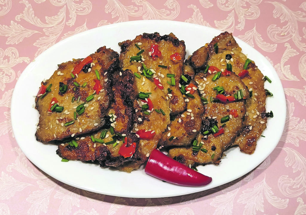 Gaļas šķēles apsusināju papīra dvielī, apviļāju kukurūzas cietē un no abām pusēm apcepu līdz brūnganai garoziņai. Tad karbonādes izliku traukā un pārlēju ar eļļas, sojas mērces un citrona sulas maisījumu un pārkaisīju ar smalki sagrieztu aso pipariņu un sasmalcinātiem sīpolu lociņiem. Uzkaisīju arī sezama sēkliņas.