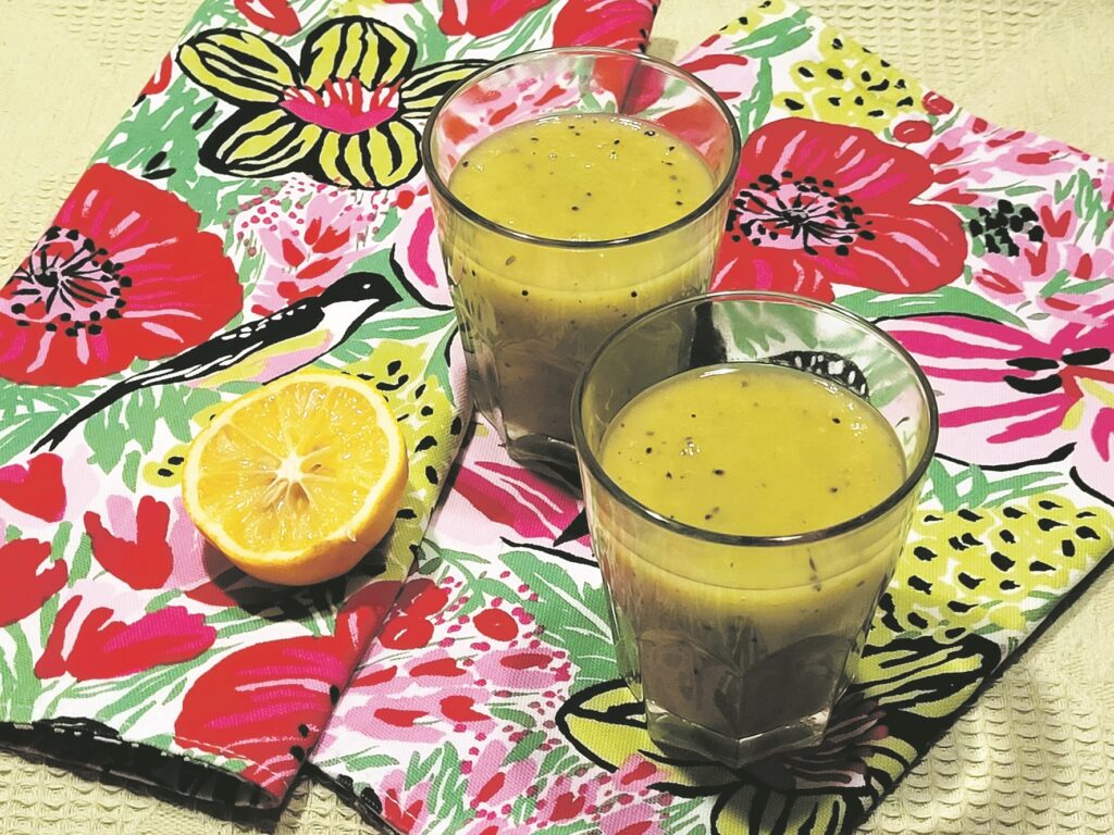 Pusei citrona izspiedu sulu. Nomazgāju un nomizoju divus nelielus banānus un divus palielus kivi, kas ir bagātīgs C vitamīna un citu vērtīgu vielu avots. Augļus sagriezu gabaliņos un liku blendera krūzē, pielēju citrona sulu un pieliku šķidru medu. Visu sasmalcināju viendabīgā biezenī un pēc tam salēju glāzēs. Baudīt caur salmiņu vai dzert tāpat – brīva izvēle, jo gards tas būs tā kā tā.