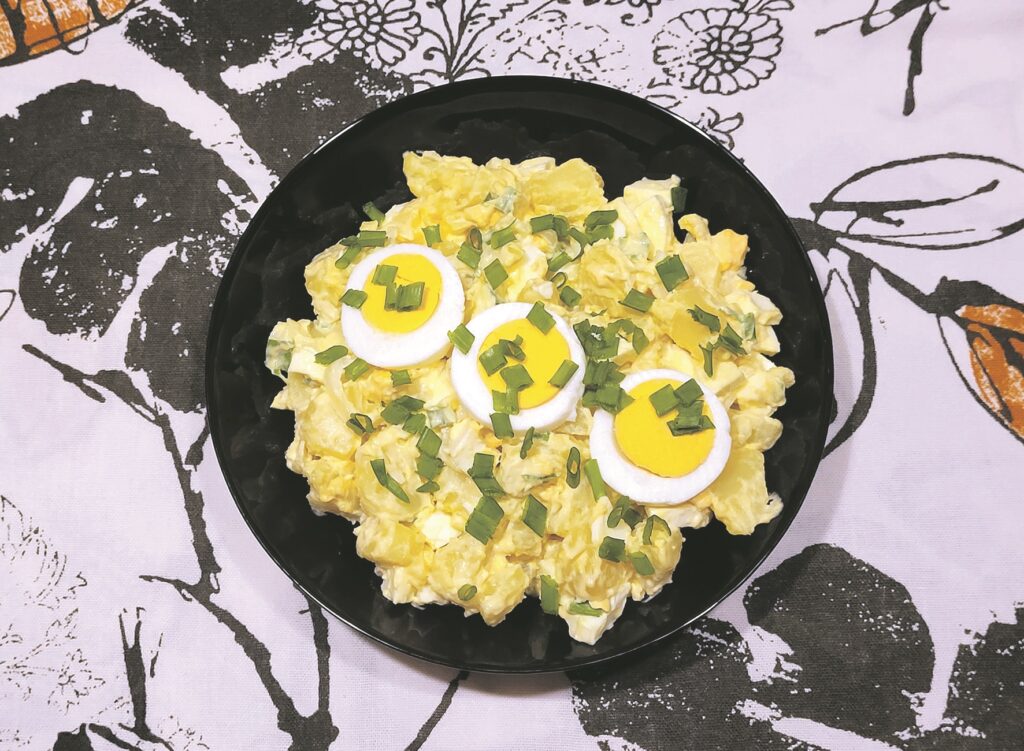 2 – 3 vārītas olas, 500 gramu vārītu kartupeļu, 200 gramu sīpolu, saišķītis lociņu, 2 ēdamkarotes etiķa, 1 ēdamkarote cukura, majonēze vai krējums, sāls, pipari.