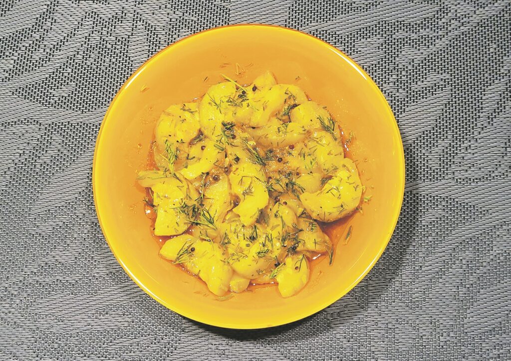 Lai gan pavasara pusē kartupeļi vairs nešķiet tik garšīgi, labā pagrabā tos iespējams saglabāt vēl ilgi. Tuvējā veikalā izdevās atrast acij tīkamākus, tādēļ daļu no tiem nolēmu izmantot arī šādu salātu pagatavošanai. Kartupeļus kārtīgi nomazgāju un izvārīju ar visu mizu. Pēc tam tos atdzesēju, nomizoju un sagriezu gabalos.