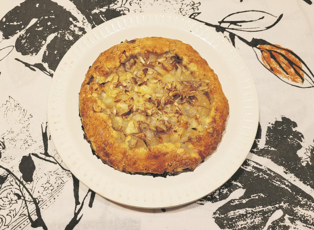 Bumbierus nomazgāju, apsusināju, sagriezu gabaliņos un izliku virs mīklas, pārslacīju ar citrona sulu, pārkaisīju ar nelielu cukura daudzumu un mandeļu skaidiņām. Mīklas malas uzliecu uz augšu tā, lai nedaudz apsegtu pildījumu, un apsmērēju ar atlikušo olu. Bumbieriem vēl šur tur uzliku arī pa sviesta piciņai. Ar cepamo papīru izklāto plāti ar sagatavoto pīrāgu ievietoju līdz 180 – 200 grādiem uzkarsētā cepeškrāsnī uz apmēram 30 minūtēm. Gatavo gardumu, pēc izvēles, vēl varam pārliet ar medu.
