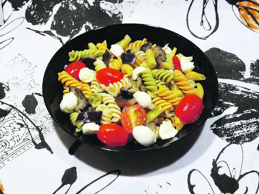 TRĪSKRĀSU makaronus izvārīju pēc norādījumiem uz iepakojuma un nokāsu. Sviesta pupiņām nogriezu galiņus, sagriezu pākstis gabaliņos un izvārīju pasālītā ūdenī. Sagrieztas pupiņu pākstis varam pievienot katlā arī dažas minūtes pirms makaronu vārīšanas beigām, tad visu nokāst, nedaudz ūdens neizlejot un atliekot. Baklažānu sagriezu gabaliņos un minūtes 20 paturēju sālsūdenī, tad noskaloju un nospiedu lieko šķidrumu. Tos apmaisot pannā ar augu eļļu cepu, līdz kļuva mīksti. Tad pievienoju spiedē sasmalcinātus ķiplokus un pusi pārgrieztu ķirštomātiņu. Piekaisīju sāli, piparus, kaltētu timiānu, pārlēju baltvīnu un apmaisot cepu, līdz lielākā daļa šķidruma bija novārījusies. Nu iemaisīju izvārītos makaronus un pākšu pupiņas, kā arī pielēju nedaudz saglabātā vārīšanas ūdens. Pievienoju arī pārējās ķirštomātiņu pusītes, piekaisīju vēl nedaudz sāls un piparu pēc garšas. Ēdienu papildināju ar mazajām siera “Mozzarella” bumbiņām. Varam izmantot arī lielo siera bumbu, to saplēšot gabaliņos.