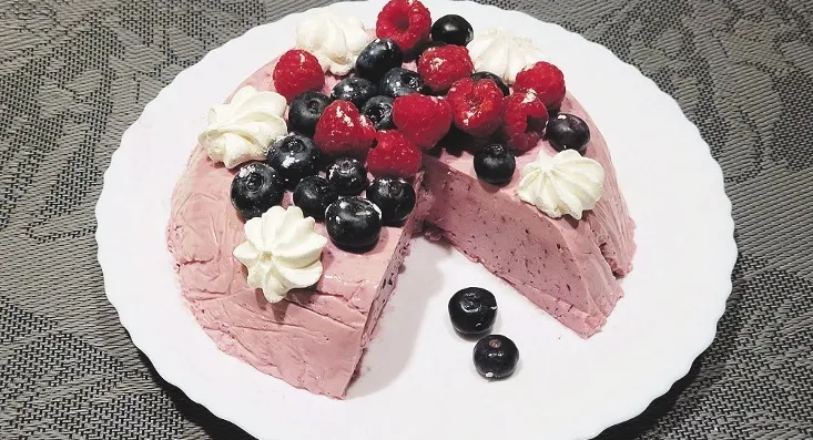 DESERTĀ skābā krējuma kūka ar izteiktu svaigu ogu aromātu būs baudījums jebkuram kārumniekam. Ogas un to proporcijas varam izvēlēties pēc savas garšas un iespējām. Atliku rotāšanai skaistākās avenes un lielogu mellenes, pārējās ogas sasmalcināju ar mietveida blenderi viendabīgā masā, ko vēl varam izberzt caur sietu. Želatīnu aplēju ar 150 mililitriem auksta novārīta ūdens un atstāju uzbriest. Uzbriedināto želatīnu samaisīju ar ogu biezeni un maisot sildīju neuzvārot, līdz tas bija izšķīdis. Noņēmu no plīts un atdzesēju. Ogu masu lēju lielā bļodā, pievienoju skābo krējumu un pūdercukuru un ar mikseri saputoju. Tad visu pārlēju ar pārtikas plēvīti izklātā veidnē un ievietoju ledusskapī sastingšanai vismaz uz 4 – 6 stundām. Vēlāk kūku uzmanīgi apvērsu uz lēzenā šķīvja un rotāju ar svaigām ogām. Tās varam papildināt ar kādu piparmētru lapiņu, kā arī pārkaisīt ar pūdercukuru.