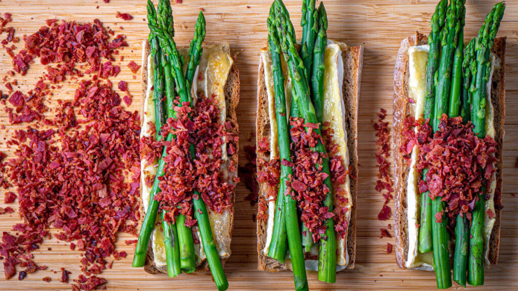 Sparģeļus novāri 2–3 minūtes ūdenī un tad dažas sekundes apdedzini uz grila vai vienkārši grilē 4 minūtes bez iepriekšējas apstrādes. Kārto sparģeļus uz grila siermaizītēm, pārkaisi ar bekona drumstalām.