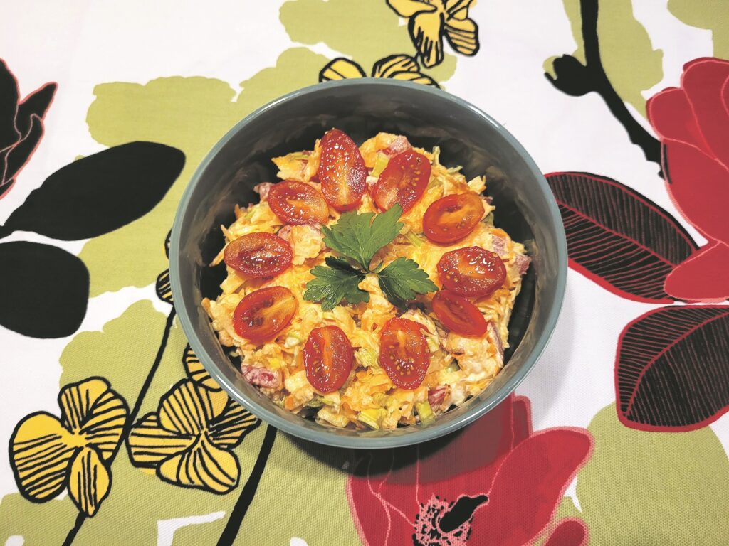 Ķirbja gabalu – to varam ņemt pat proporcionāli vairāk nekā citas salātu sastāvdaļas – nomizoju un sarīvēju uz rupjās rīves. Svaigu burkānu nomazgāju, notīrīju un arī sarīvēju. Purava balto daļu sagriezu pusgredzenos. Gabaliņos sagriezu tomātu. Visu, piekaisot arī sāli pēc garšas, samaisīju ar mērci, ko šoreiz pagatavoju, sajaucot kopā skābo krējumu ar majonēzi, taču droši vien tai varam izmantot arī veselīgāko bezpiedevu jogurtu. Baudot šos svaigos salātus, ķirbja garša nemaz nebija jūtama.