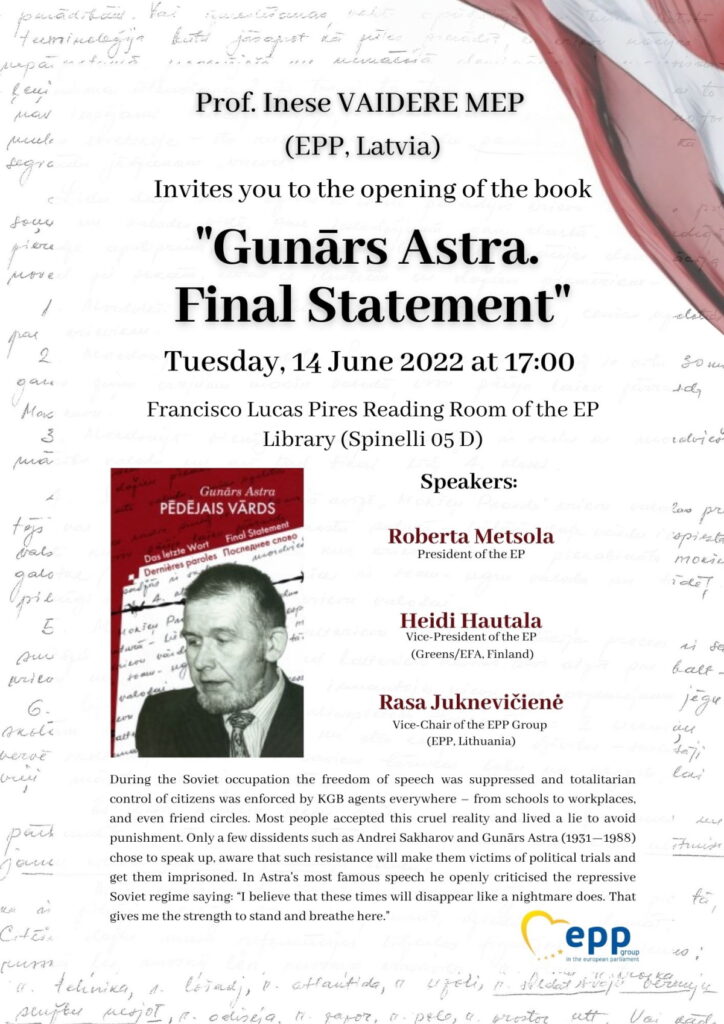 Otrdien 14. jūnijā, Eiropas Parlamentā (EP) tiks prezentēta grāmata “Gunārs Astra. Pēdējais vārds”. Pasākumu organizē EP deputāte Inese Vaidere, bet ievadvārdus teiks EP prezidente Roberta Metsola un vairākas vadošas Parlamenta amatpersonas.
