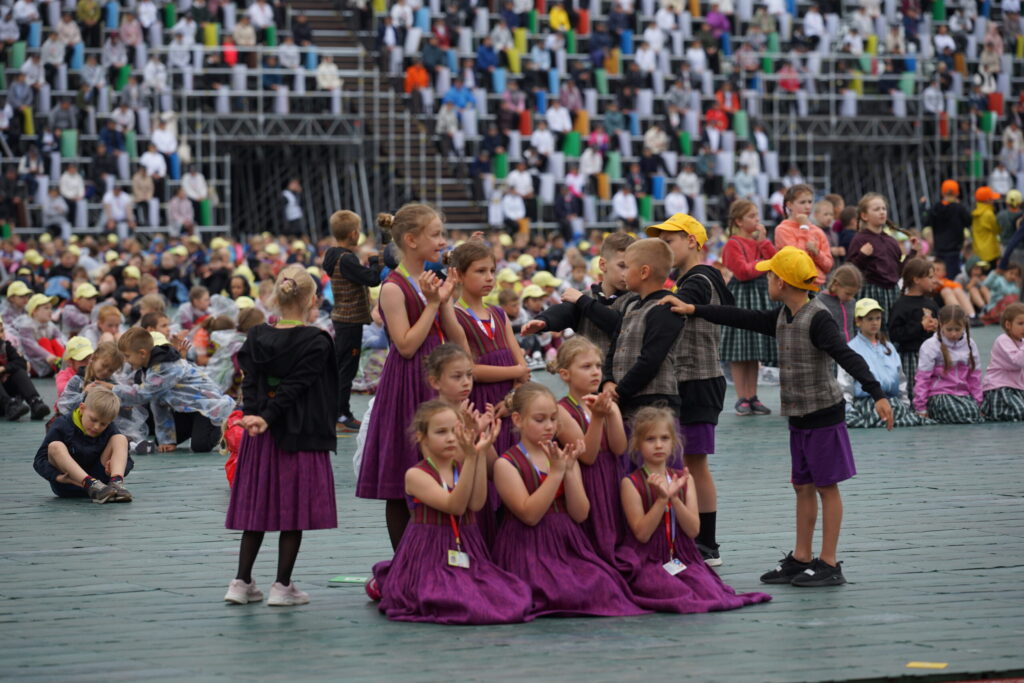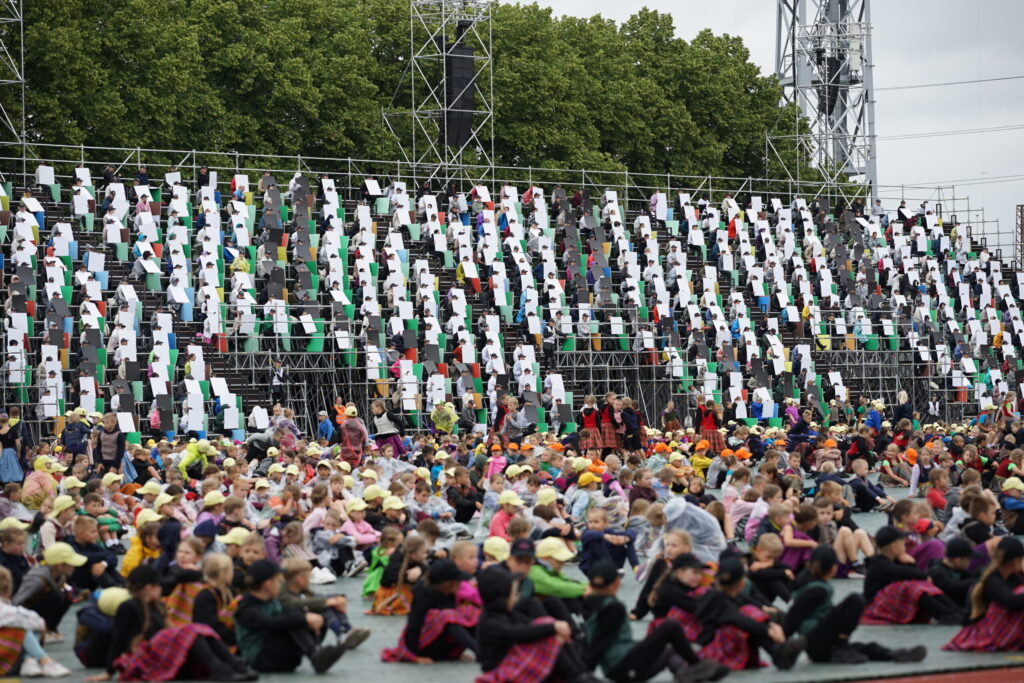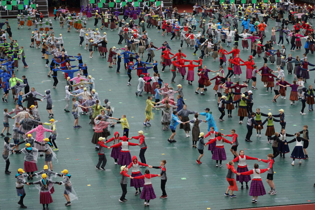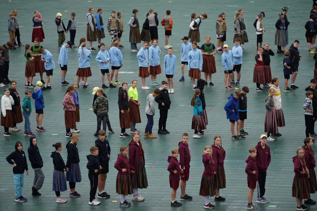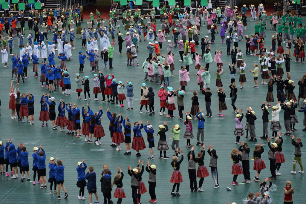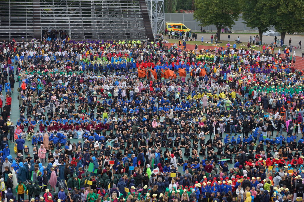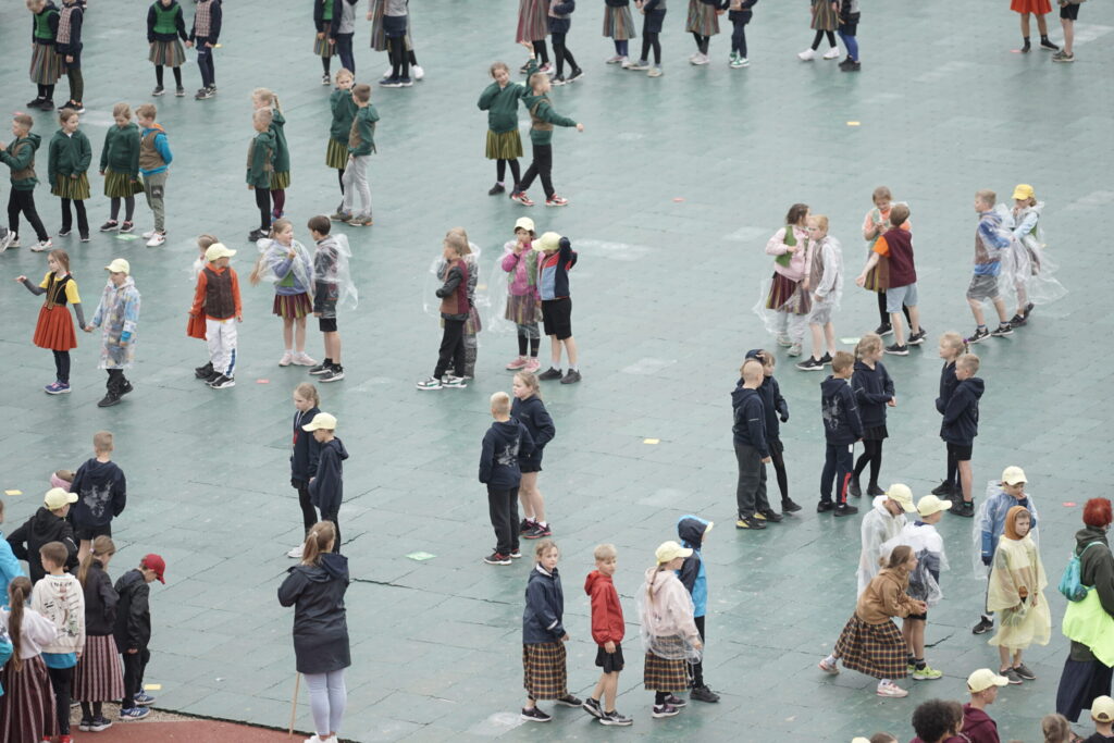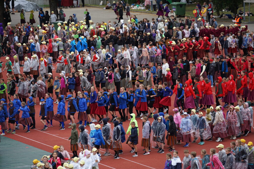 Ceturtdienas XIII Latvijas Skolu jaunatnes dziesmu un deju svētku mēģinājums Daugavas stadionā.