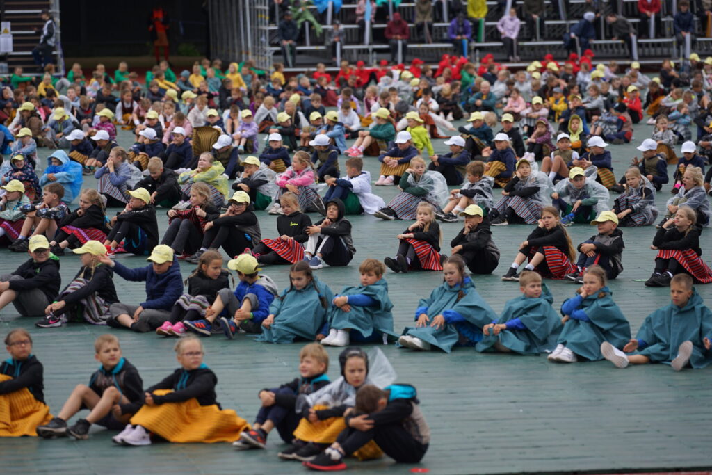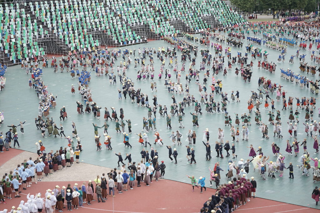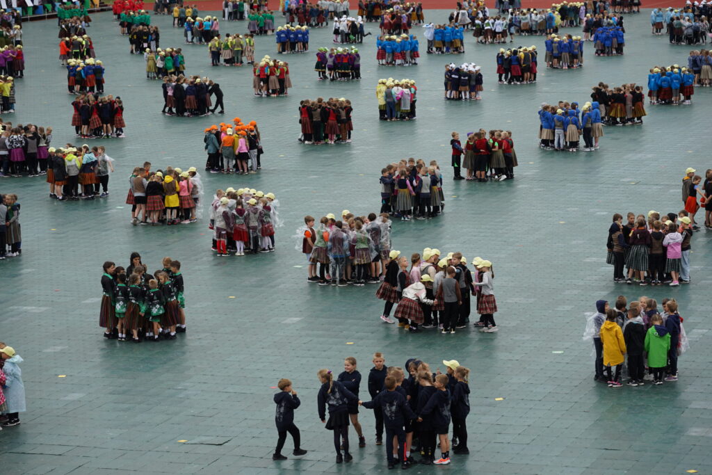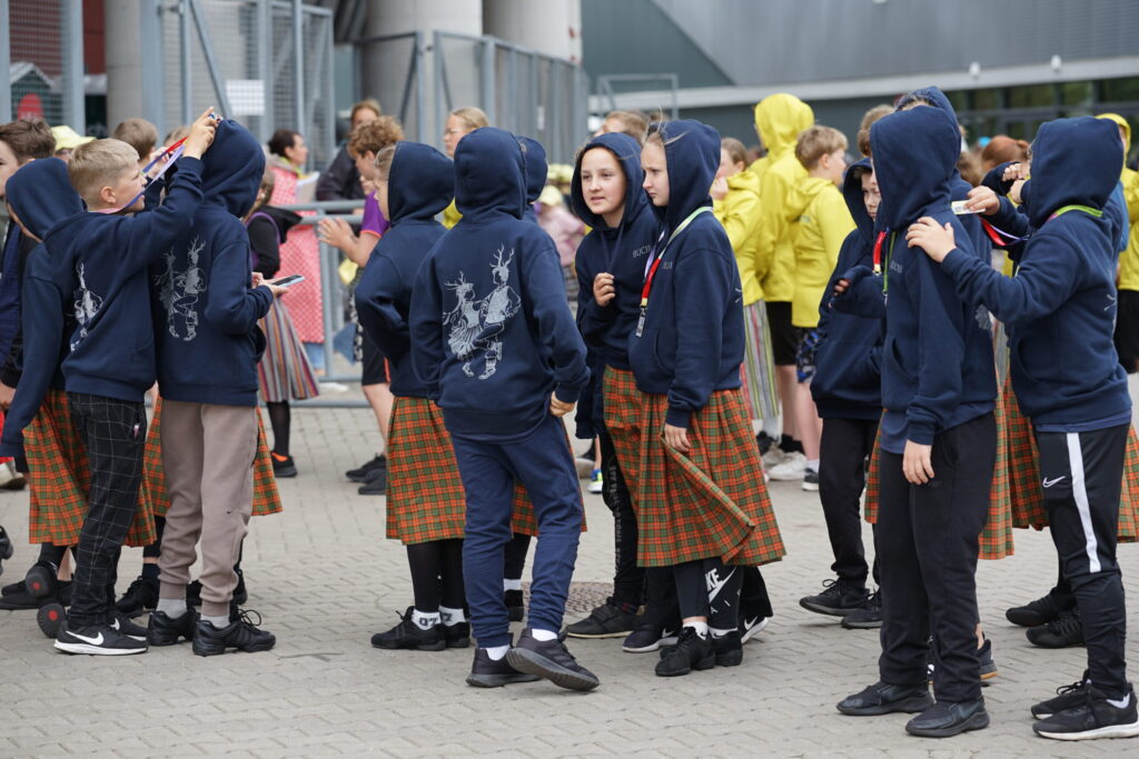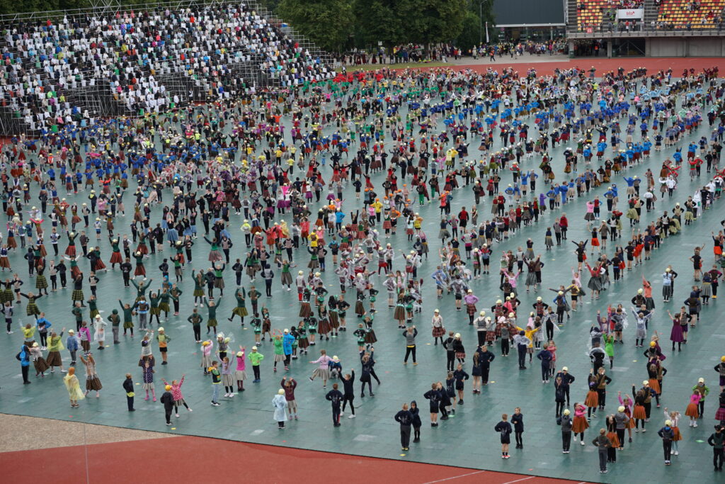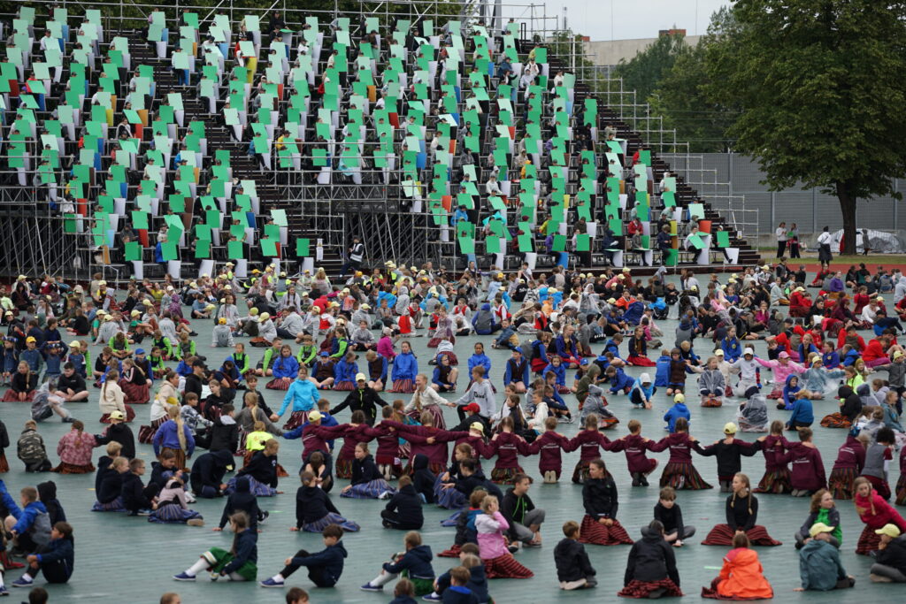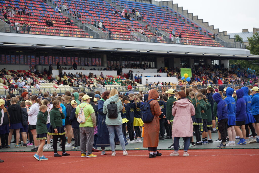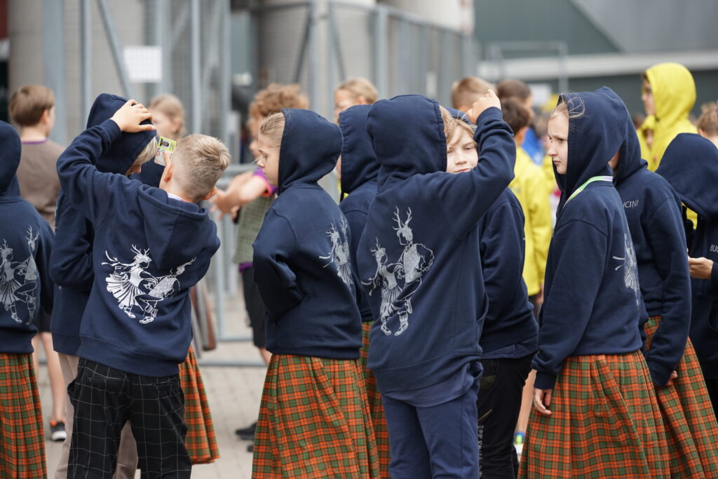 Ceturtdienas XIII Latvijas Skolu jaunatnes dziesmu un deju svētku mēģinājums Daugavas stadionā.