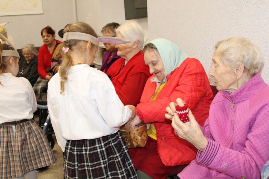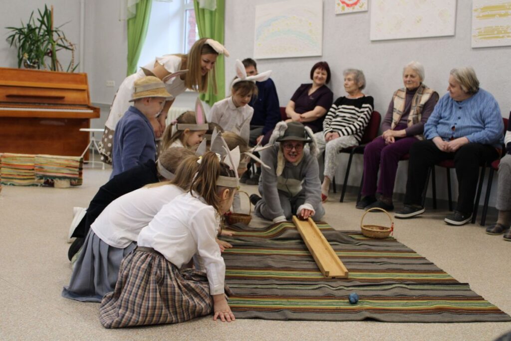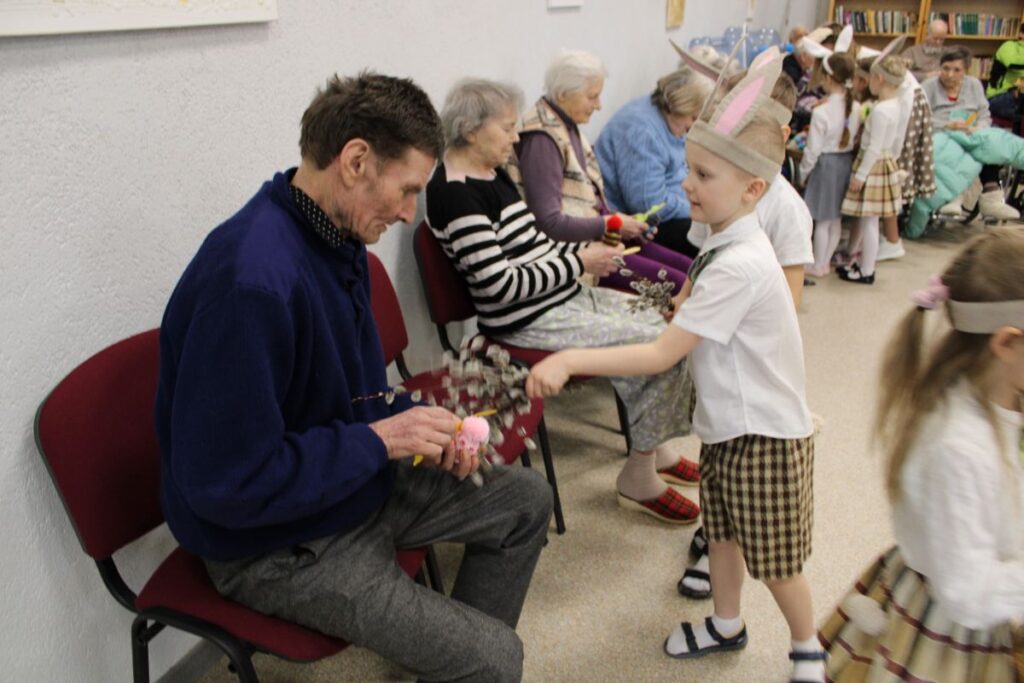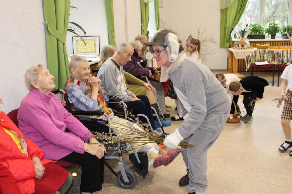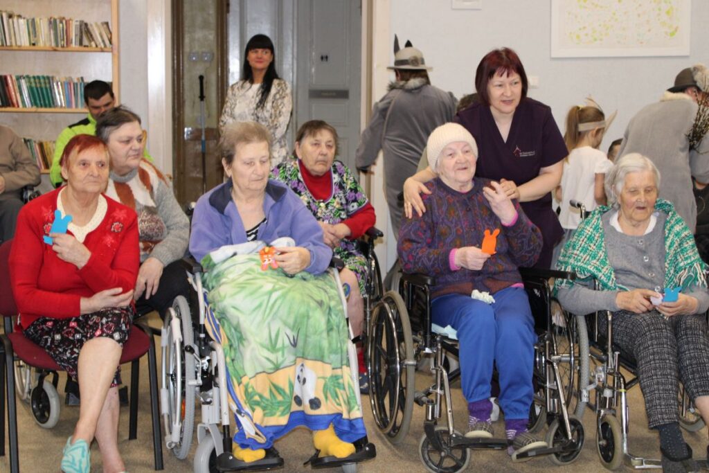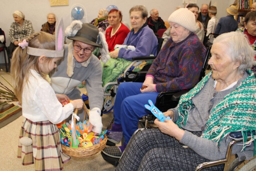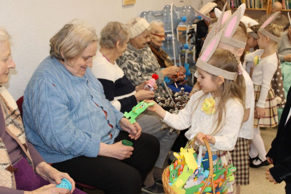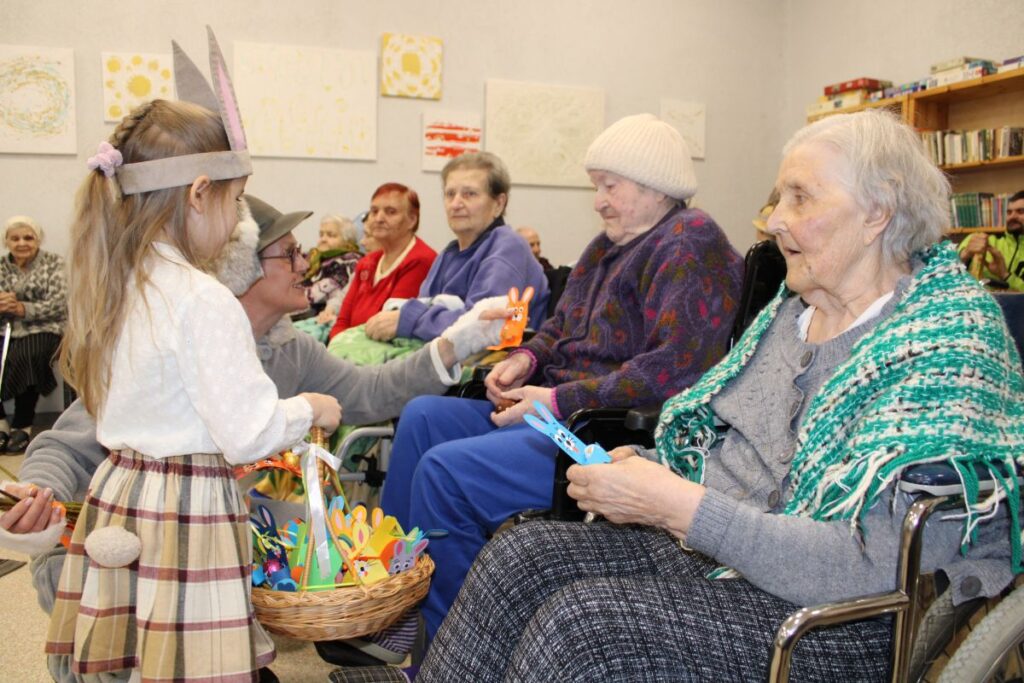 Grupiņu “Rūķi” un “Zaķēni” bērni un viņu pirmsskolas skolotājas Gunta Mežule un Inguna Slapjuma, un mūzikas skolotāja Lāsma Serdāne viesojās nodaļā pirms Lieldienām, rādot svētku uzvedumu, izdalot līdzi atvestās dāvanas un iepriecinot pansionāta iemītniekus un darbiniekus.