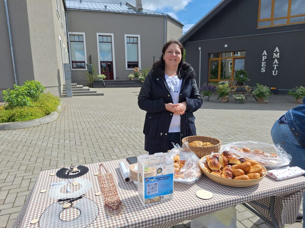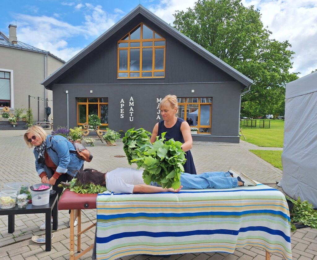 Līdztekus tirdziņam Apes Kultūras centra un Amatu mājas pagalmā varēja satikt pirts meistari Santu Meleci. Interesentiem bija iespēja dabūt pērienu ar zaļo augu slotiņu un pagatavot savu īpašo ķermeņa skrubi.