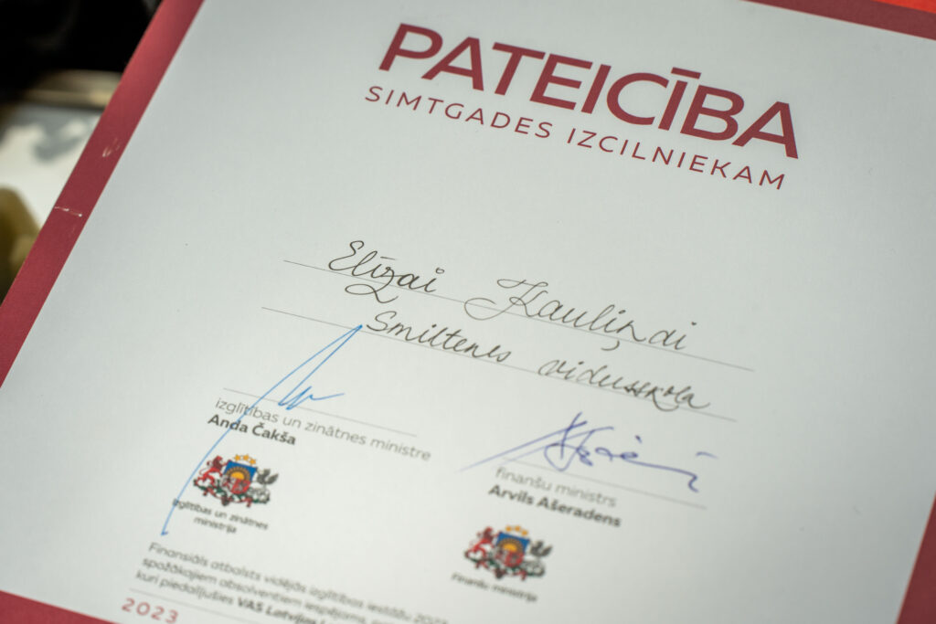 Simtgades izcilnieka pateicību un balvu par izciliem mācību sasniegumiem un aktīvu sabiedrisko darbu saņēma absolvente Elīza Kauliņa – Smiltenes vidusskolas jauniešu pašpārvaldes prezidente, daudzu skolas pasākumu organizatore un liela dejotāja. Šobrīd Elīza kopā ar deju kolektīvu “Buki” piedalās XXVII Vispārējos latviešu Dziesmu un XVII deju svētkos. Bet pēc tam priekšā ceļš uz augstkolu, kas visticamāk, aizvedīs uz kādu no Rīgas Tehniskās universitātes fakultātēm. Vidusskolā Elīza padziļināti apguva matemātiku, programmēšanu un angļu valodu. Visu vidusskolas laiku viņa bija arī viena no Smiltenes novada pašvaldības stipendiātēm. “Esmu ļoti pateicīga gan Smiltenes novada pašvaldībai, gan citiem mecenātiem par stipendijām, kuras viņi man piešķīruši. Tas ir patīkami, ka tavu darbu pamana un novērtē. Pēdējā mācību gadā stipendijas ļoti noderēja autoskolas braukšanas nodarbībām. Savukārt stipendijas, kuras saņēmu izlaidumā, noderēs, ieejot dzīves jaunajā posmā. Brīvlaikā Elīza nolēmusi kārtīgi atpūsties, taču viņa noteikti atradīs arī laiku, lai atkal uzzīmētu kādu skaistu apsveikuma kartiņu – tas ir viens no viņas vaļaspriekiem un reizē neliels ienākumu avots. Elīza ir arī Smiltenes Mākslas skolas absolvente. Vēl viņa vasarā būs viena no vadītājām bērnu vasaras nometnē “Leiputrija”. “Man ļoti patīk darboties ar bērniem, tāpēc šo darbiņu vairāk uztveru kā atpūtu. Un ja vēl par to var arī kaut ko nopelnīt, tad ko vairāk var vēlēties?”