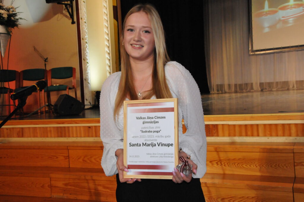 Otrdien, 14. novembrī, Valkas pilsētas kultūras namā Valkas Jāņa Cimzes ģimnāzijas 7. -12. klasēm notika Latvijas Republikas proklamēšanas svētku pasākums “Tēvzemes novadi dziesmu vārdos vīti”. Jau 18. reizi ģimnāzijas direktore Lilita Kreicberga pasniedza ģimnāzijas īpašo Pateicības zīmi – Sudraba pogu. To saņēma 2022./2023. mācību gada absolvente Santa Marija Vīnupe. Viņa centralizētajos eksāmenos guva visaugstāko novērtējumu. Skolēnu pašpārvalde sveica arī Spēka sacensību “Spīdola un Lāčplēsis” uzvarētājus – titula “Spīdola 2023” ieguvēju Gabrielu Ozoliņu un titula “Lāčplēsis 2023” ieguvēju Edvardu Petenoku.