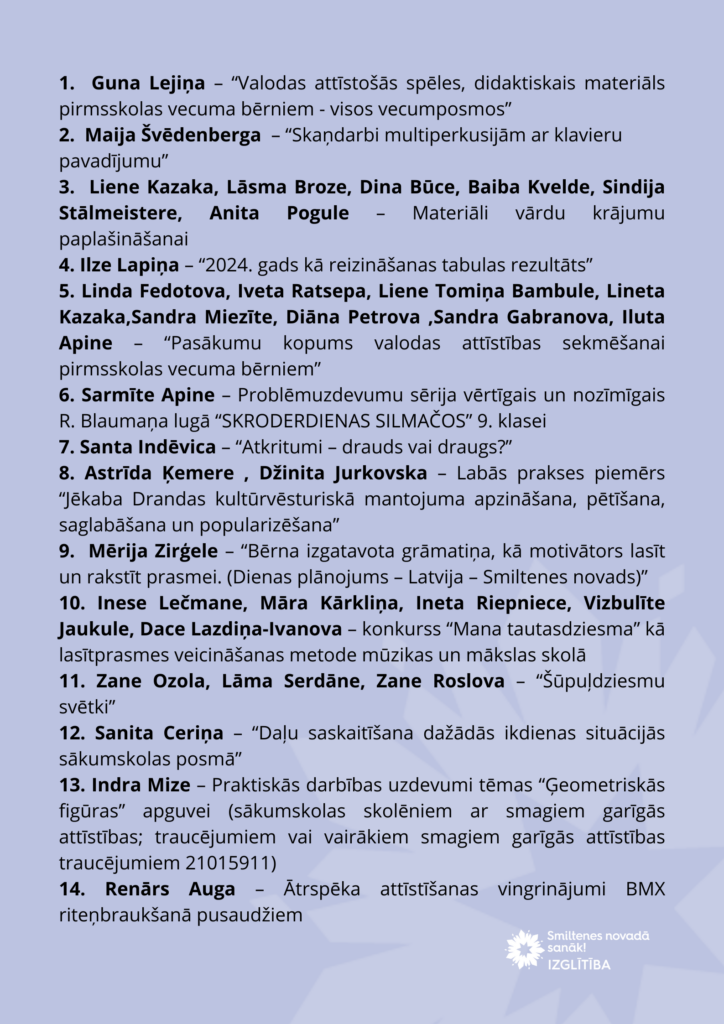 - Mērija Zirģele – “Bērna izgatavota grāmatiņa, kā motivātors lasīt un rakstīt prasmei. (Dienas plānojums – Latvija – Smiltenes novads)”;