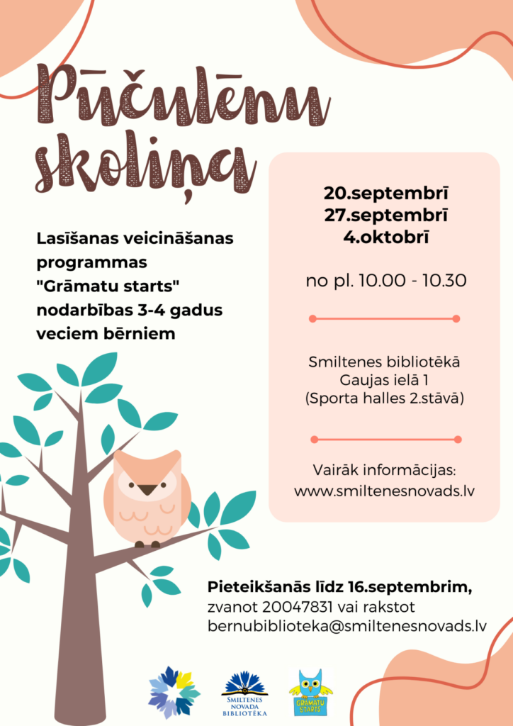 Smiltenes novada bibliotēkas Bērnu apkalpošanas nodaļa aicina 3 – 4 gadus vecus bērnus kopā ar vecākiem piedalīties lasīšanas veicināšanas programmas “Grāmatu starts” nodarbībās “Pūčulēnu skoliņa”.