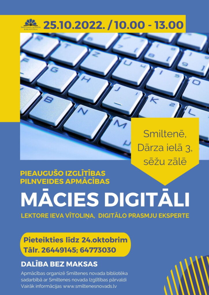 Smiltenes novada bibliotēka un Smiltenes novada Izglītības pārvalde piedāvā iedzīvotājiem digitālās kompetences paaugstināšanas iespēju un aicina seniorus un citus interesentus pieteikties digitālo prasmju apmācībām “Mācies digitāli”. Apmācības būs piemērotas visiem, kuri vēlas uzsākt lietot digitālos rīkus un apgūt pamatus digitālo prasmju izmantošanai savai izaugsmei.