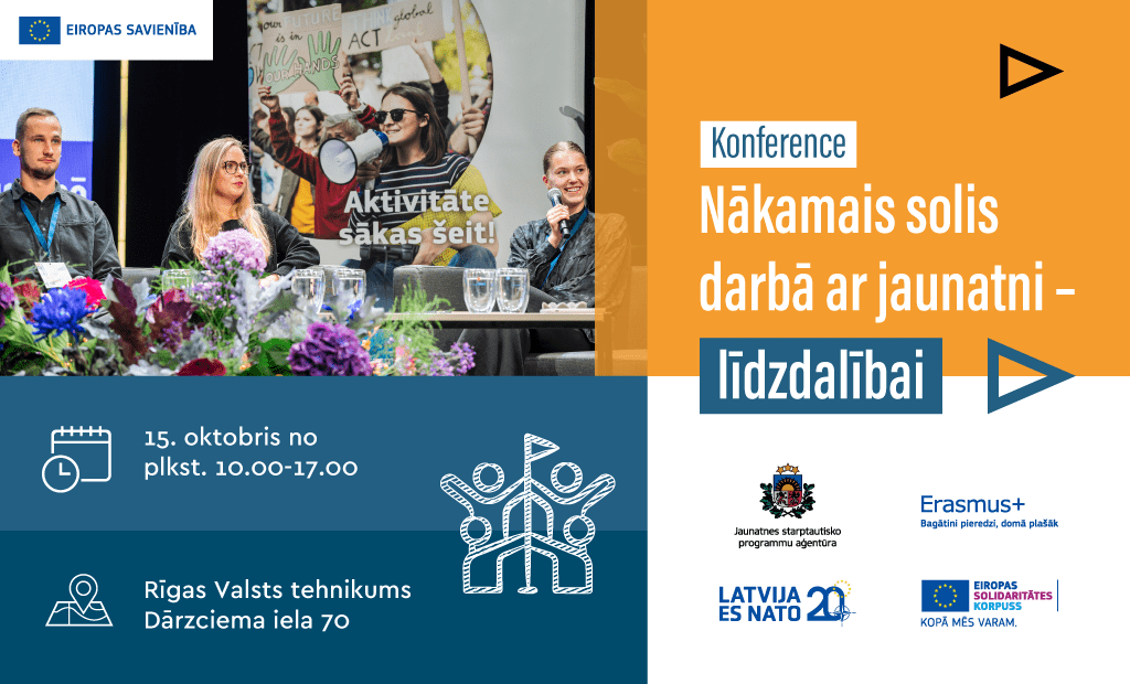 Jaunatnes starptautisko programmu aģentūra (JSPA) aicina ikvienu darbā ar jaunatni iesaistīto līdz 29. septembrim pieteikties konferencei “Nākamais solis darbā ar jaunatni – līdzdalībai”, kas notiks 15. oktobrī plkst. 10.00 Rīgas Valsts tehnikumā (Dārzciema iela 70). Tās laikā būs iespēja uzzināt par līdzdalības būtību, nozīmi sabiedrībā un soļiem jauniešu līdzdalības veicināšanai, kā arī gūt iedvesmu un jaunas idejas, klātienē satikt jomas ekspertus un uzzināt starptautisku pieredzi no ārvalstu ekspertiem.