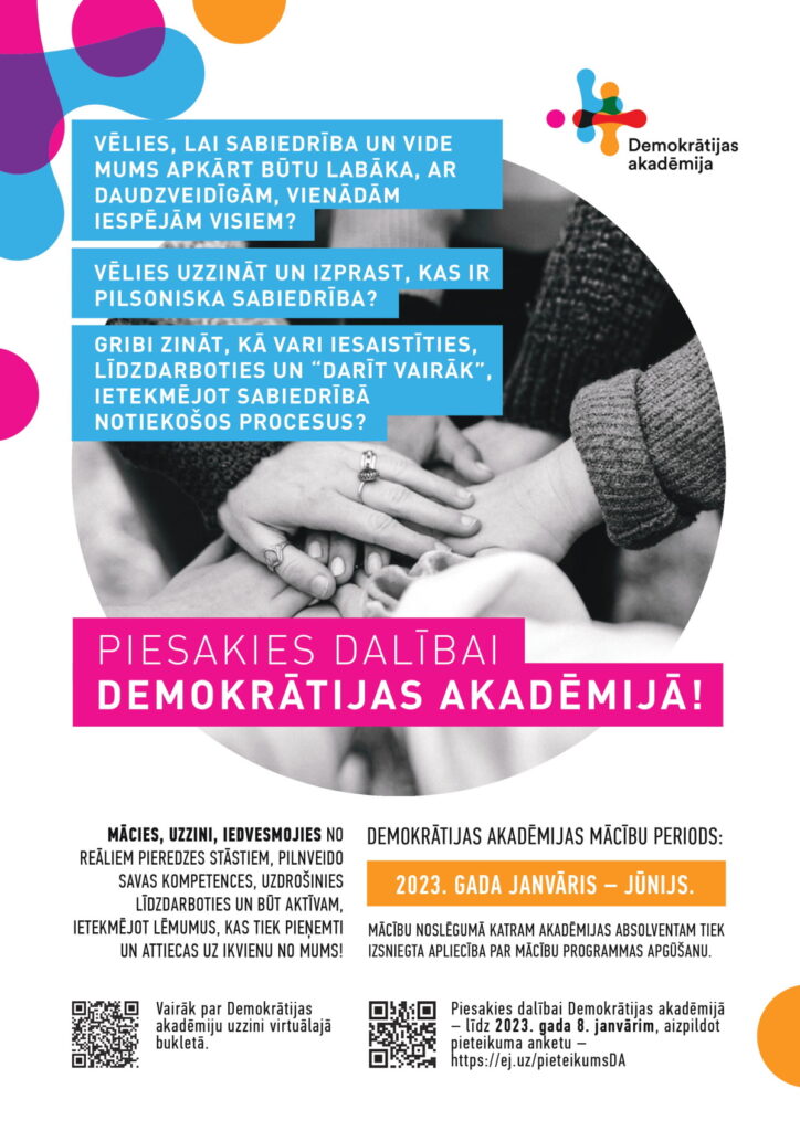 Lai pilnveidotu zināšanas par iesaistīšanos valsts norisēs, tādējādi stiprinot vietējo kopienu līderu, nevalstisko organizāciju (NVO) un publiskās pārvaldes kapacitāti, aicinām pieteikties mācību programmai “Demokrātijas akadēmija” līdz 8. janvārim tiešsaistē. Mēneša izskaņā, 30. janvārī programmas atklāšana notiks Latvijas Valsts prezidenta rezidencē, Rīgas pilī kopā ar Valsts prezidentu Egīlu Levitu un Eiropas Parlamenta deputāti Sandru Kalnieti.