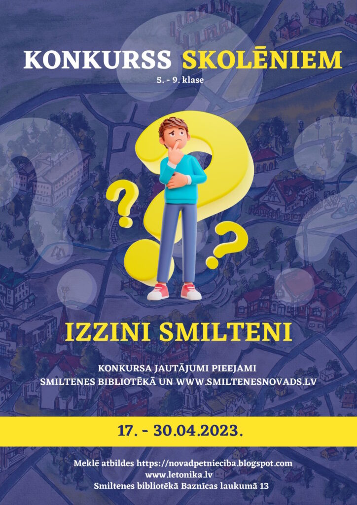 Smiltenes bibliotēkas Bērnu apkalpošanas nodaļa no 17. līdz 30.aprīlim aicina 5. – 9.klašu skolēnus piedalīties konkursā “Izzini Smilteni!”.