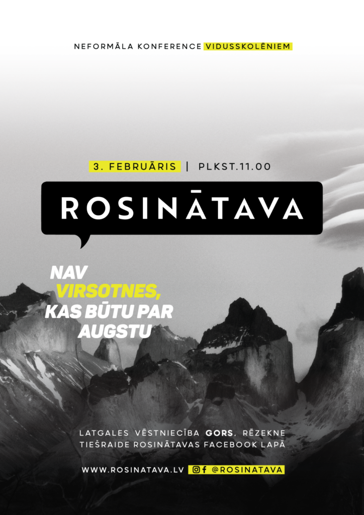 “Nav virsotnes, kas būtu par augstu” – ar šādu devīzi Latvijā pazīstamas un iedvesmojošas personības pulcēs Latvijas vidusskolēnus neformālajā un izglītojošajā konferencē “Rosinātava”. Pasākums jauniešiem notiks 2022. gada 3. februārī, kurā aicinām piedalīties jebkuru vidusskolēnu no Smiltenes un Smiltenes novada, elektroniski aizpildot reģistrācijas anketu.