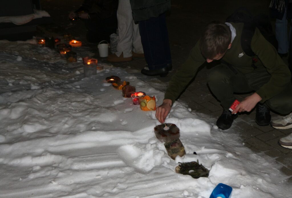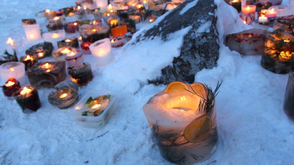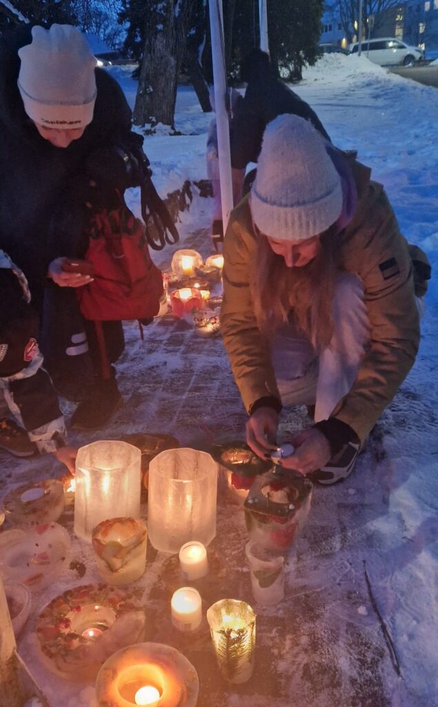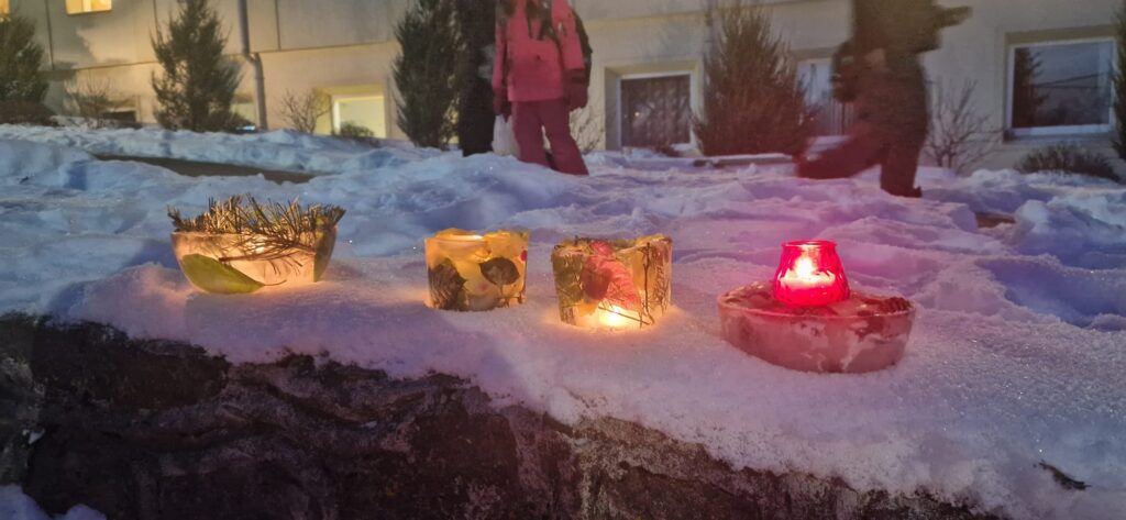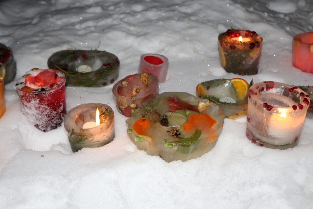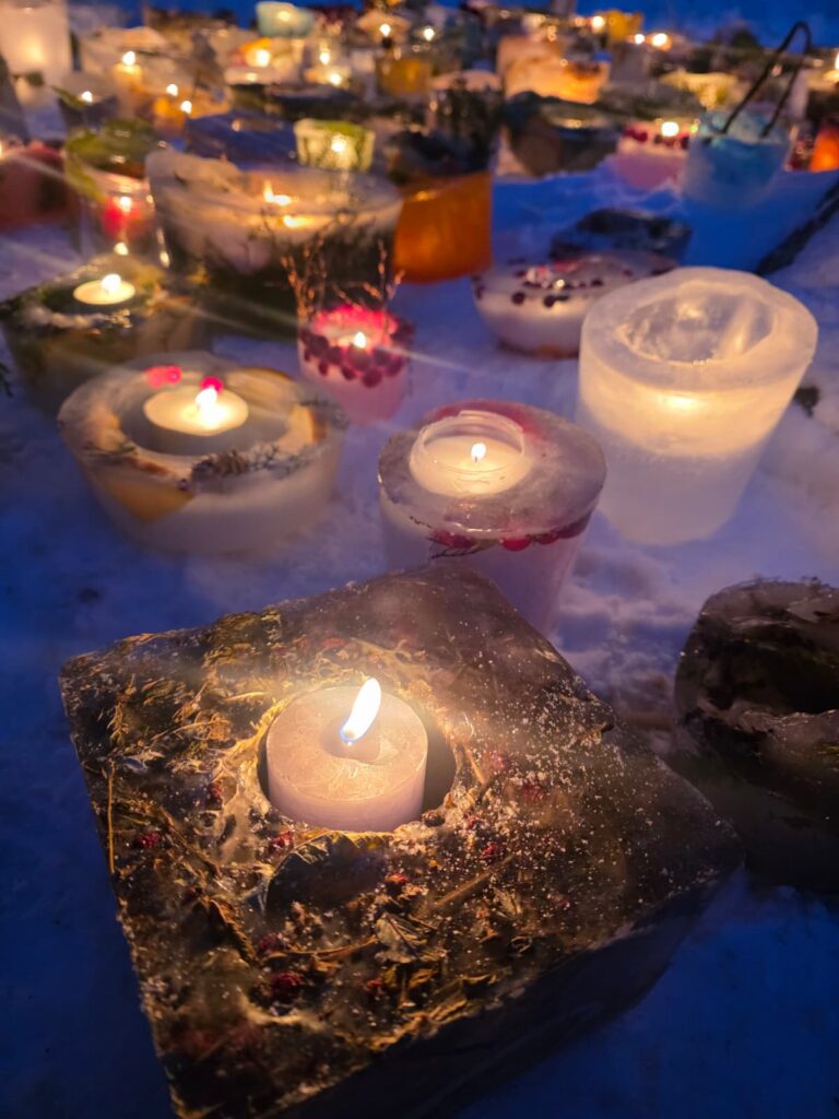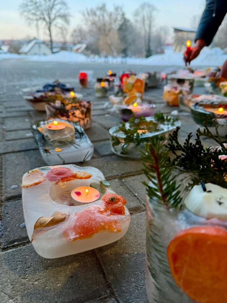 Ledus svecītēs vizuļo ogas, sūnas un koku zariņi, atgādinot par latvieša saikni ar dabu un mūsu senču gara spēku, dzīves gudrību, mūsu dziesmām, valodu, tradīcijām un dvēseles bagātību, kas turpinās bērnos un mazbērnos.