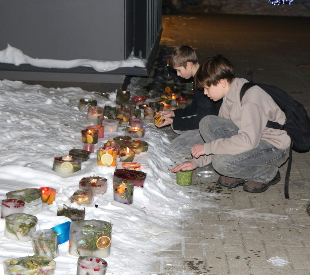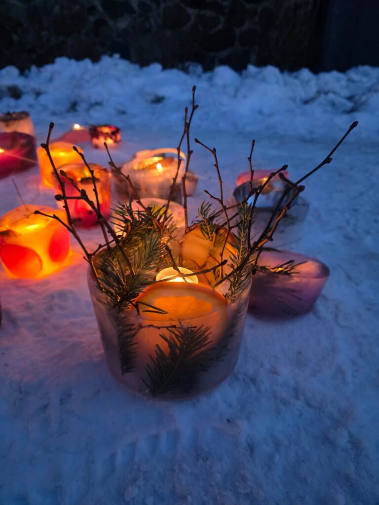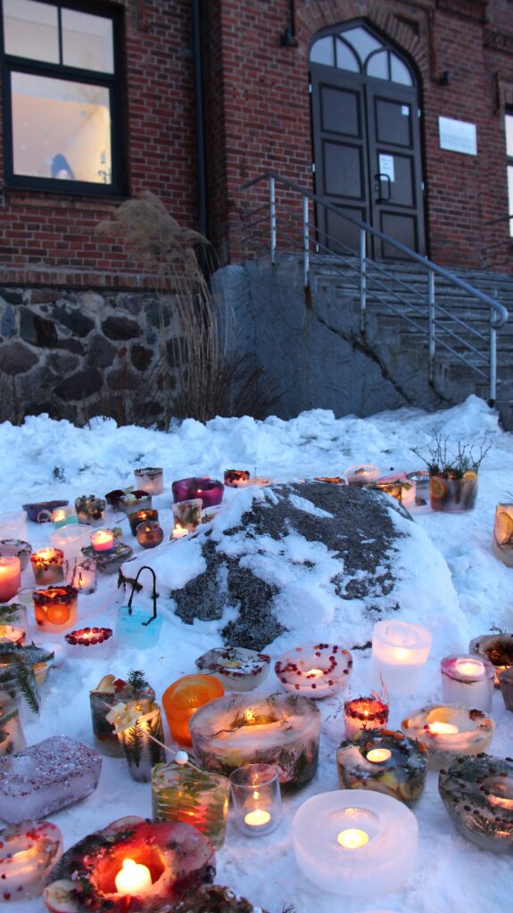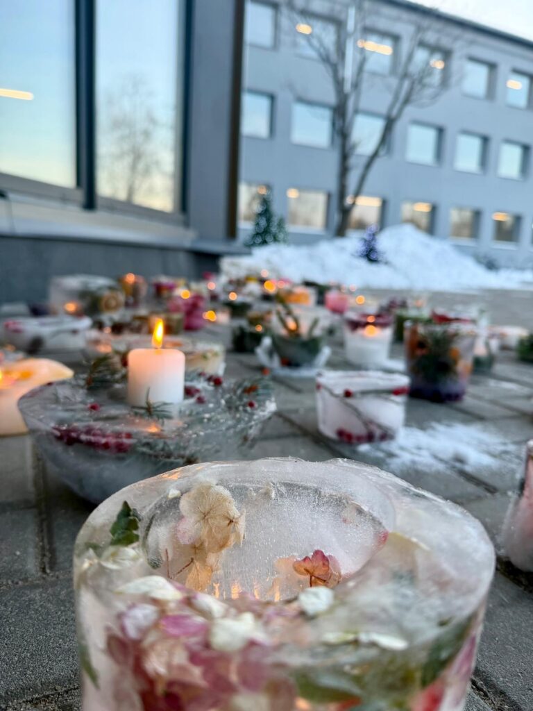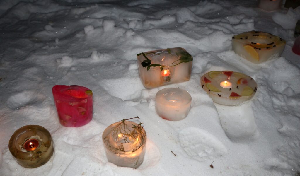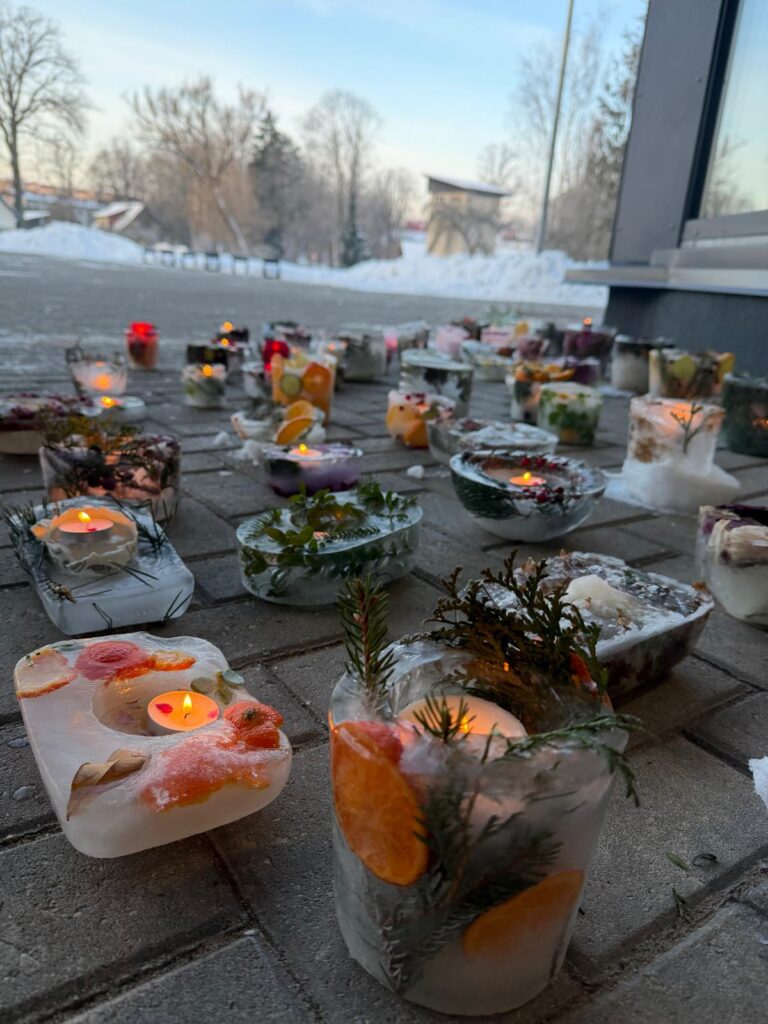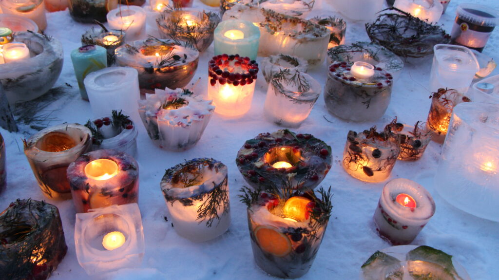 Ledus svecītēs vizuļo ogas, sūnas un koku zariņi, atgādinot par latvieša saikni ar dabu un mūsu senču gara spēku, dzīves gudrību, mūsu dziesmām, valodu, tradīcijām un dvēseles bagātību, kas turpinās bērnos un mazbērnos.