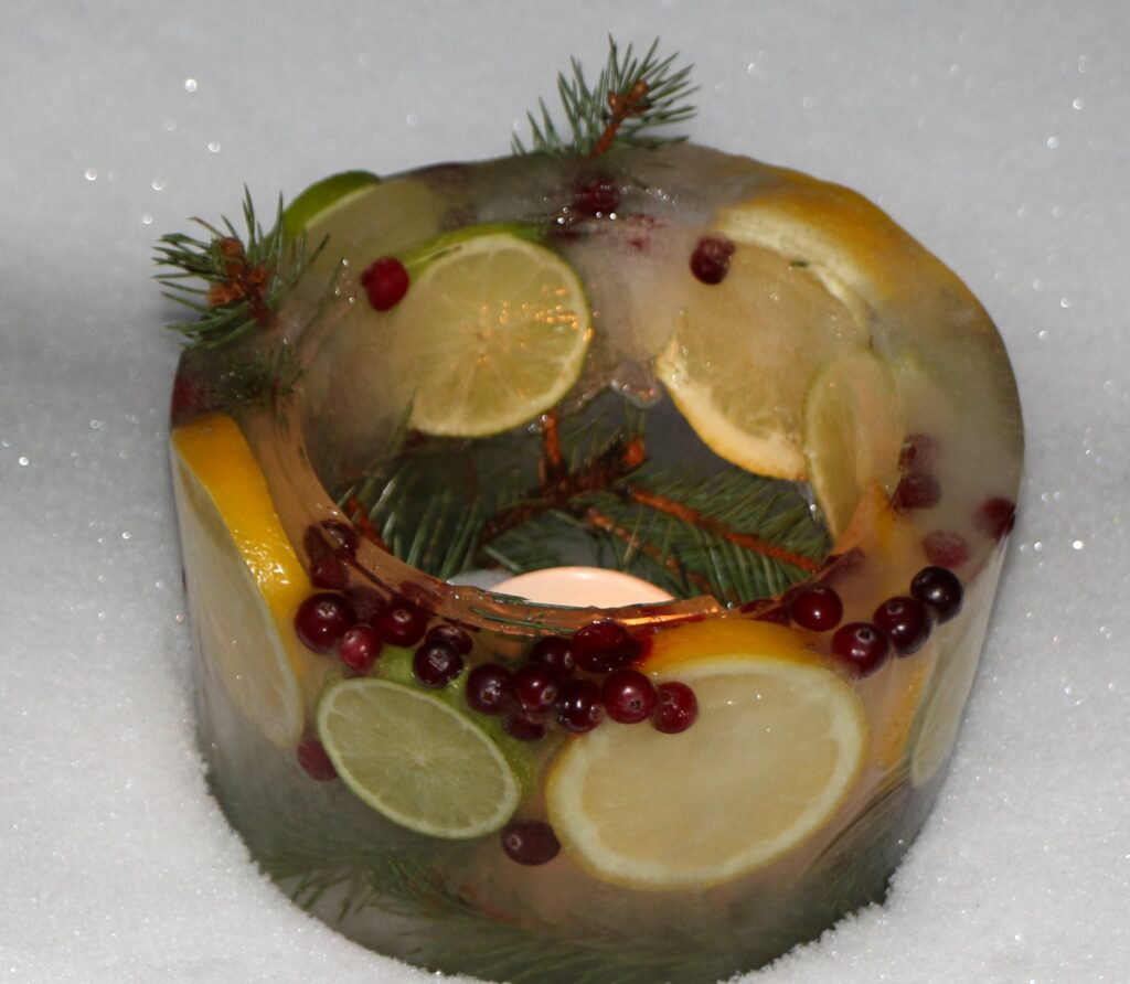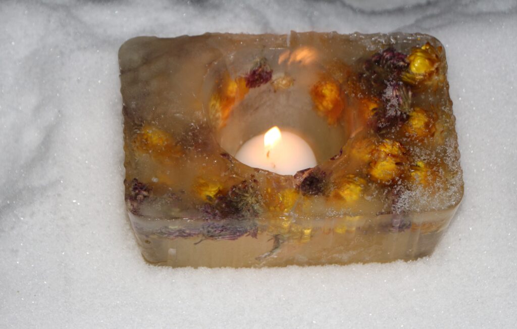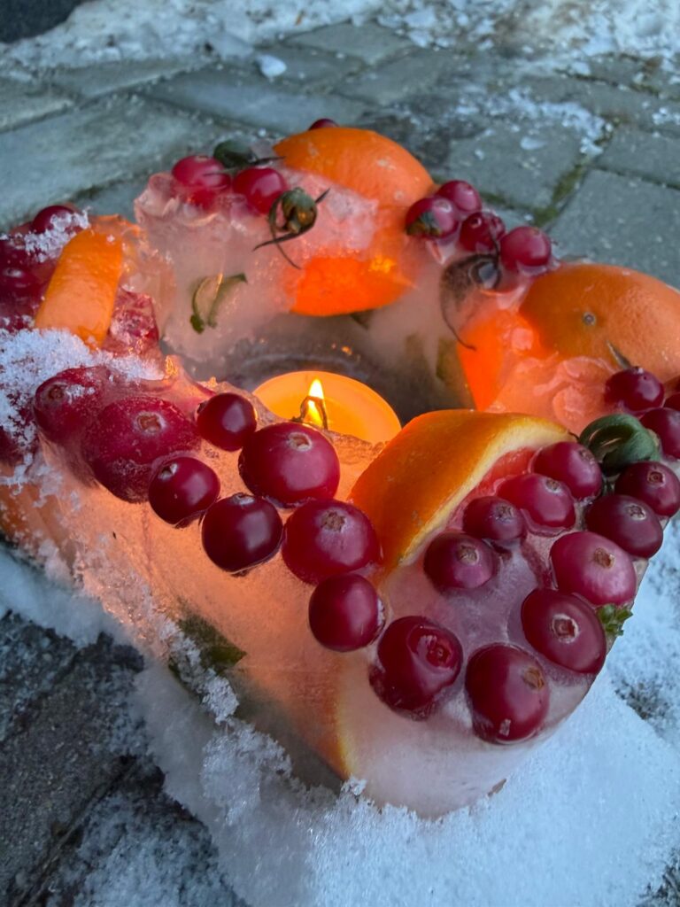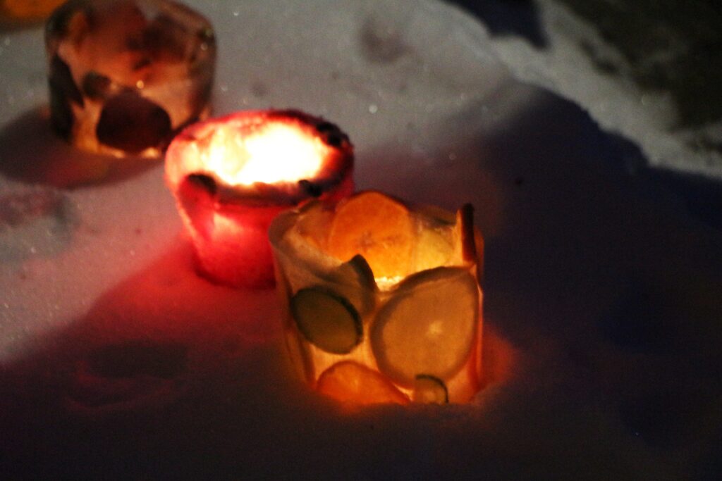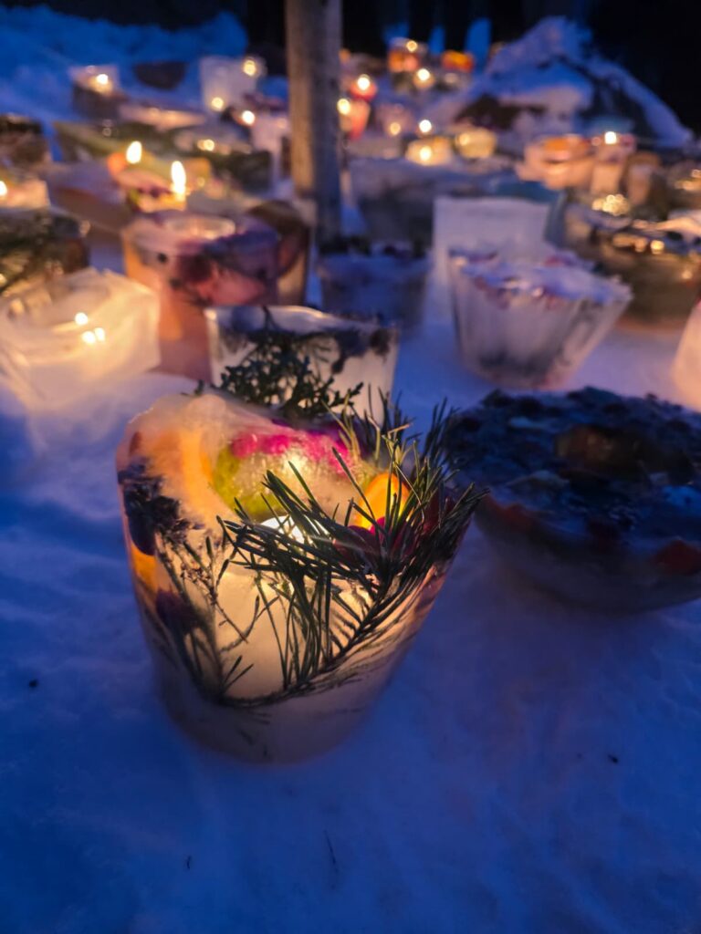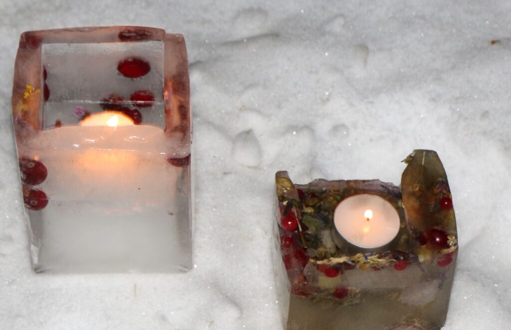 Ledus svecītēs vizuļo ogas, sūnas un koku zariņi, atgādinot par latvieša saikni ar dabu un mūsu senču gara spēku, dzīves gudrību, mūsu dziesmām, valodu, tradīcijām un dvēseles bagātību, kas turpinās bērnos un mazbērnos.