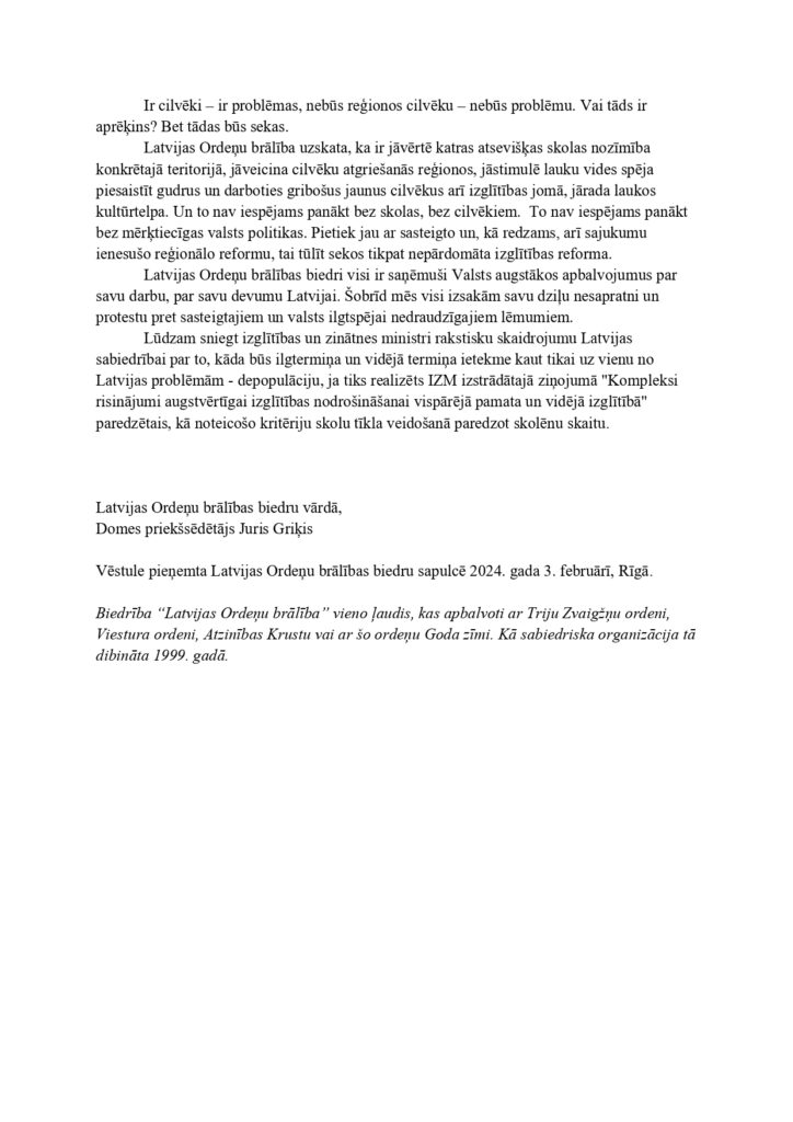 Vēstule pieņemta Latvijas Ordeņu brālības biedru sapulcē 2024. gada 3. februārī, Rīgā.