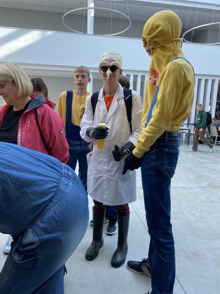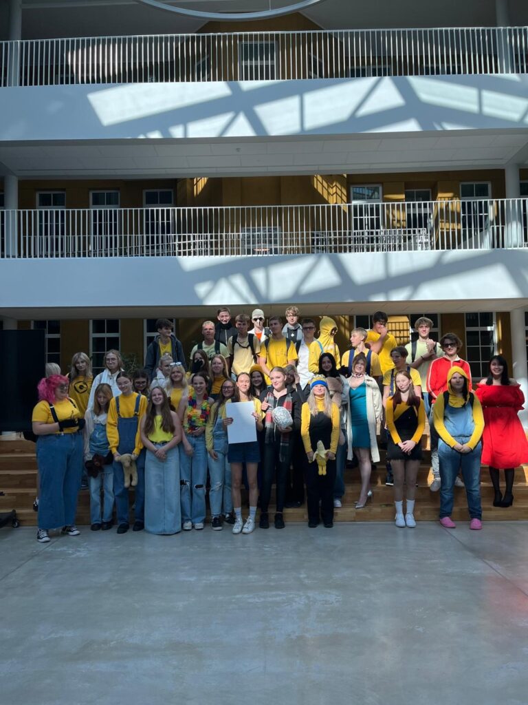 10.klašu skolēni pirmajā iesvētību dienā, tērpušies Minjonu kostīmos, sacerēja savu īpašo dzejoli.