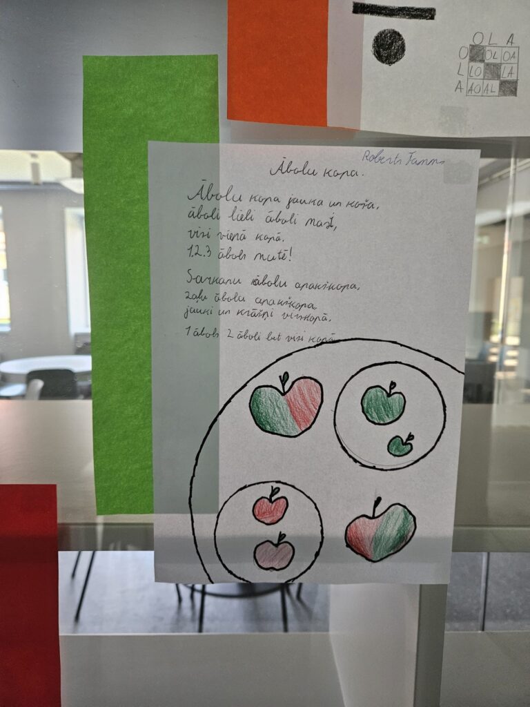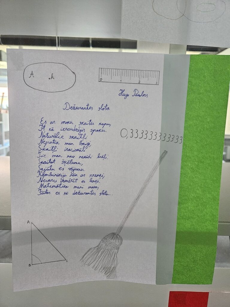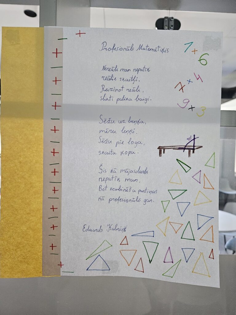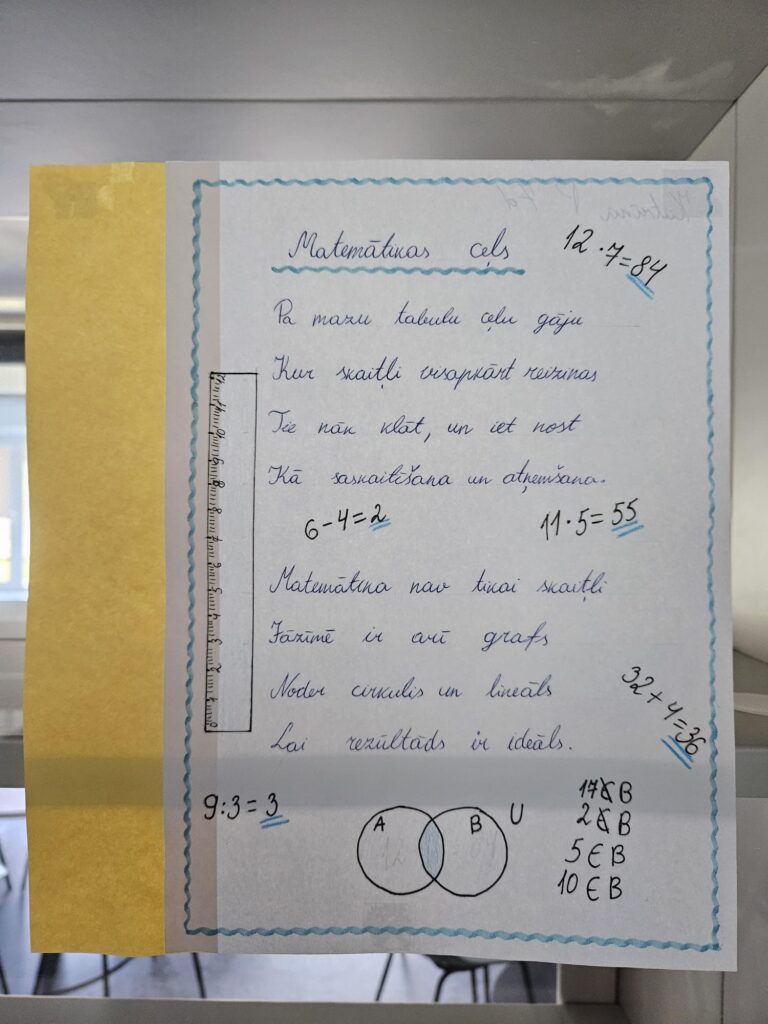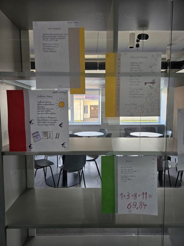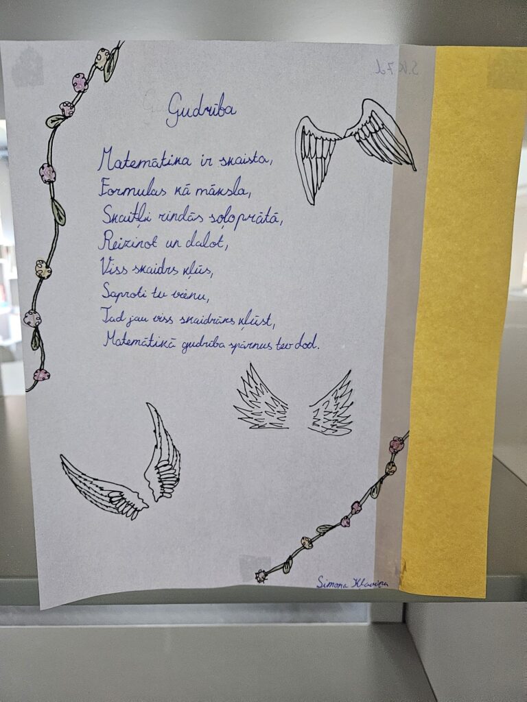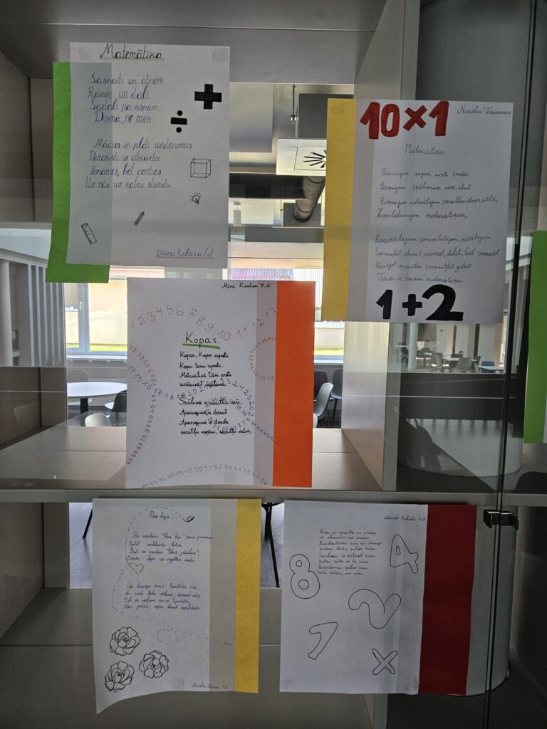 7.d klases skolēni fakultatīvajās matemātikas stundās, skolotājas Montas Konstantes rosināti, devās uz bibliotēku un meklēja dzejoļos matemātikas elementus – skaitļus, ģeometriskās figūras u.c. Apgūstot kombinatoriku, tapa šai tēmai veltīti dzejoļi, kas tagad, glīti noformēti, aplūkojami skolas bibliotēkā. 7.klašu skolēni septembrī gatavoja arī Dzejas dienu grāmatiņas, ko pēc tam prezentēja klasesbiedriem. 8.klašu skolēni vizualizēja dzejoļus fotogrāfijās.