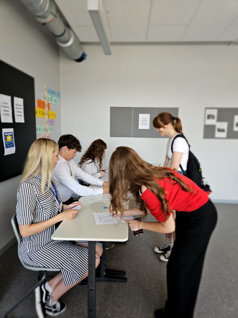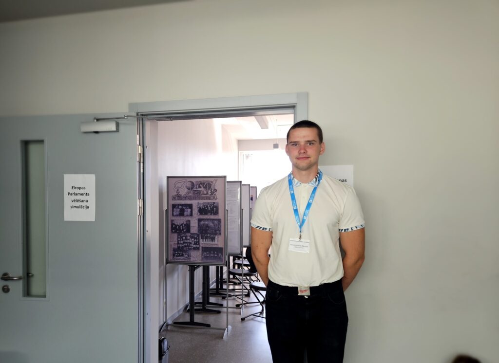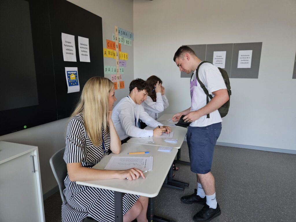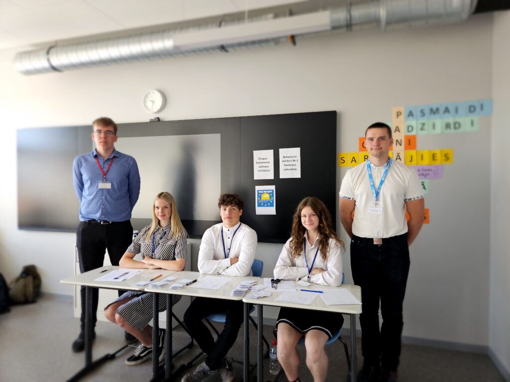 Eiropas Parlamenta vēlēšanu simulāciju organizēja 11. klases skolnieks Dāvis Grabovskis kopā ar darba grupu: Simonu Sarkangalvi, Evelīnu Valaini, Reini Robertu Rāceni un Jāni Vaheru.