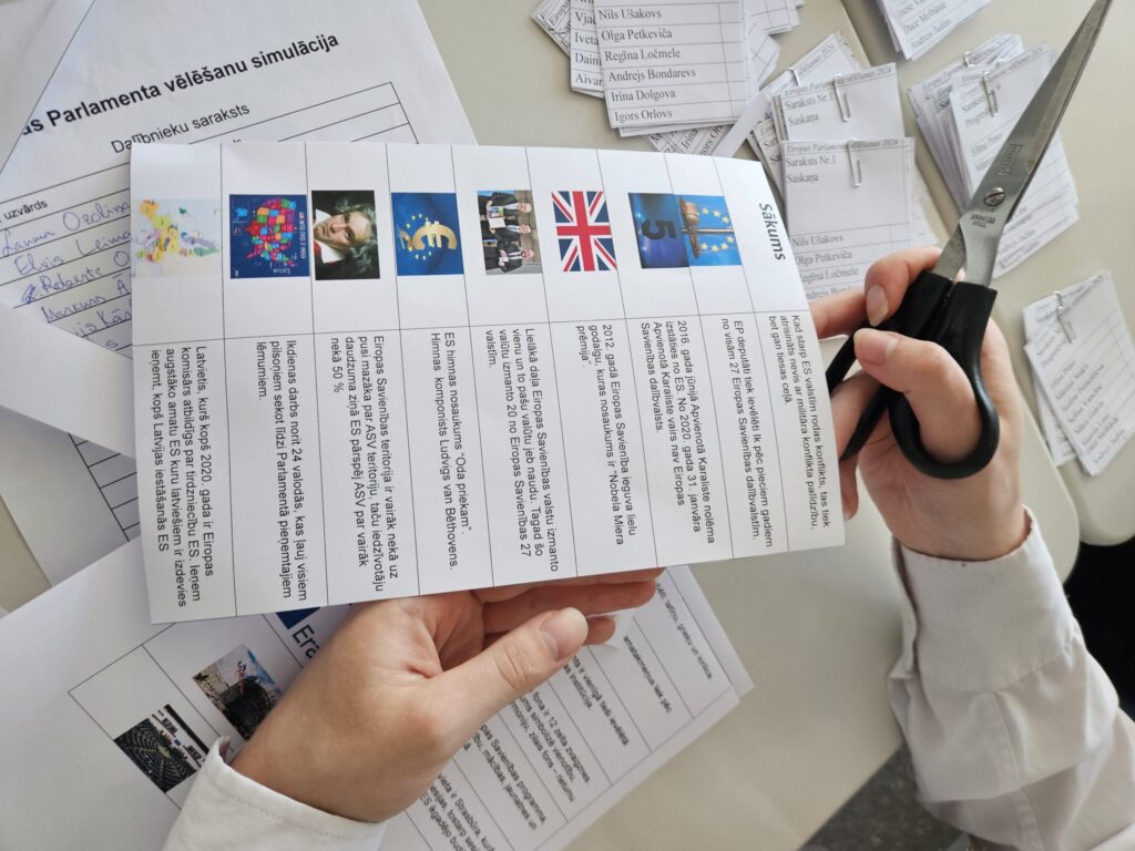 Pirms vēlēšanu simulācijas pasākuma organizatori iepazīstināja skolasbiedrus ar partijām, kuras pēc tirgus un sabiedriskās domas pētījumu centra SKDS aptaujām iekļūtu Eiropas paralamentā, ja vēlēšanas notiktu jau maijā.