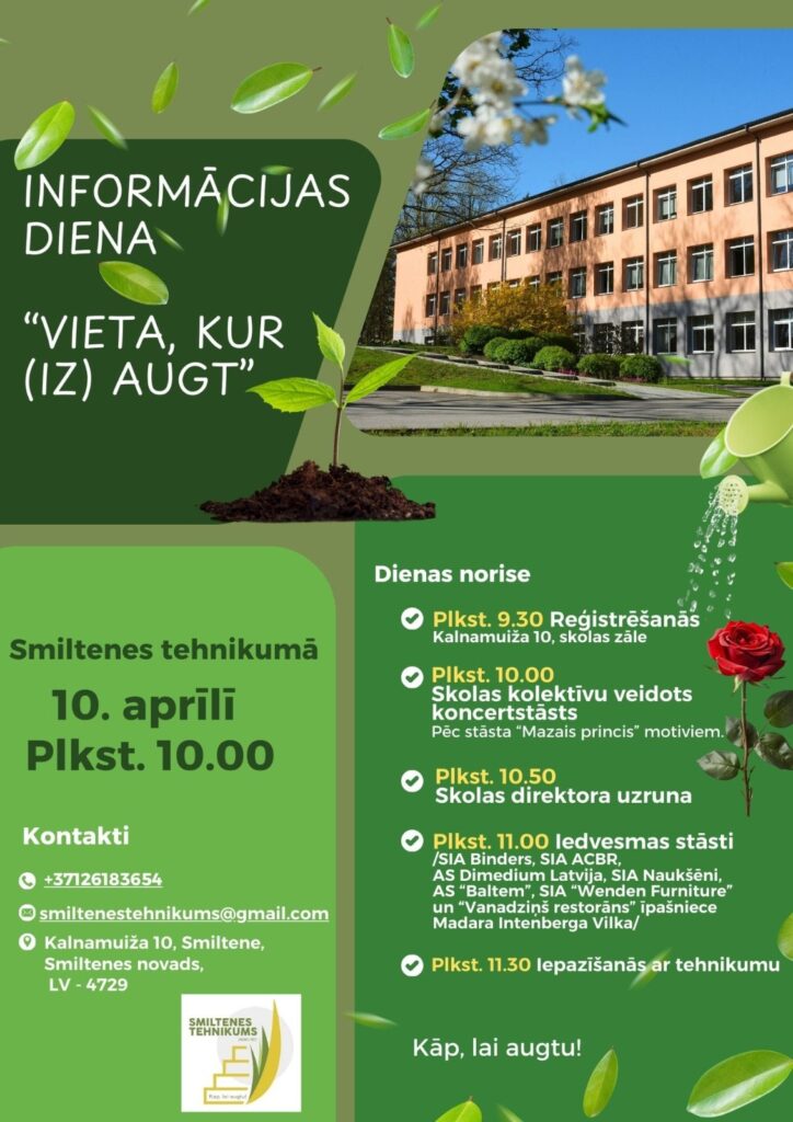 Informācijas diena, kurā nākamie audzēkņi varēs iepazīties ar tehnikuma mācību programmām, skolotājiem, kā arī ar interešu izglītību un materiālo bāzi, notiks 2025. gada 10. aprīlī plkst.10.00 Smiltenē.