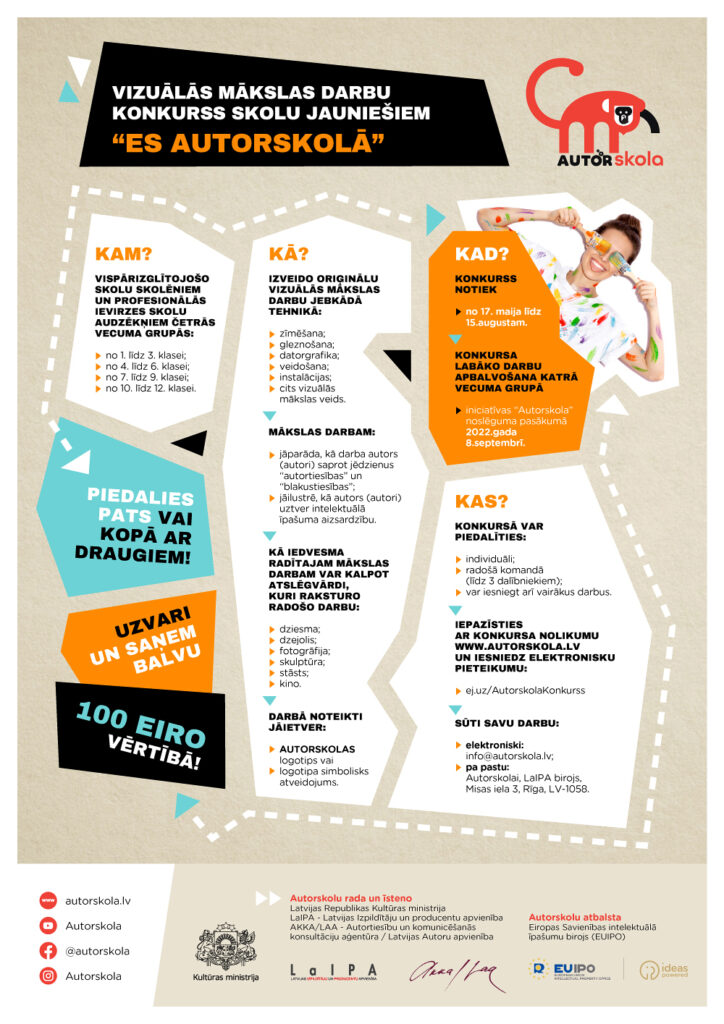 Kultūras ministrija (KM), Latvijas Izpildītāju un producentu apvienība (LaIPA) un Autortiesību un komunicēšanās konsultāciju aģentūra / Latvijas Autoru apvienība (AKKA/LAA) izsludina radošo darbu konkursu jauniešiem – “Autorskola.” Tā dalībnieki var iesniegt darbus līdz šā gada 15.augustam un konkursa uzvarētāji tiks apbalvoti iniciatīvas noslēguma pasākumā septembrī.