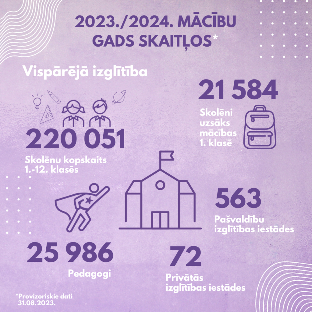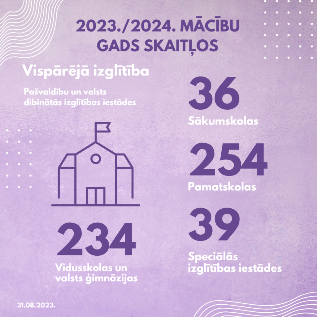 Jaunajā mācību gadā darbu uzsāks 563 pašvaldību vispārējās izglītības iestādes, no tām 36 sākumskolas, 254 pamatskolas, 231 vidusskola un valsts ģimnāzija, kā arī 39 speciālās izglītības iestādes, divas ar iespēju iegūt arī profesionālo pamata vai vidējo izglītību un viena vakara (maiņu) un neklātienes vidusskola. Vispārējā izglītībā 1.septembrī durvis vērs arī 72 privātās izglītības iestāde.