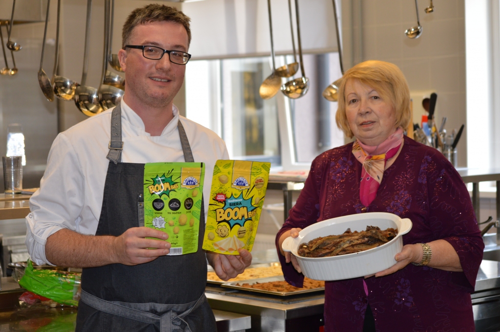 Biedrības “Siera klubs” valdes priekšsēdētājas Vandas Davidanovas rosināts, šefpavārs Tomass Godiņš meistarklasē gatavoja arī salātus no Carnikavas nēģiem un akciju sabiedrības “Smiltenes piens” jaunā produkta – siera uzkodas “Siera Boombas”. Foto: Sandra Pētersone