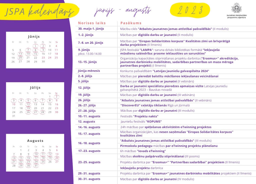 Kā zināms, vasara ir daudzveidīgu iespēju un pasākumu laiks! Lai savos plānotājos laicīgi ierakstītu un saplānotu mācības, pasākumus un citas jaunatnes jomas aktivitātes, sagatavots jūnija, jūlija un augusta mēnešu kalendārs. Ar to iespējams iepazīties šeit.