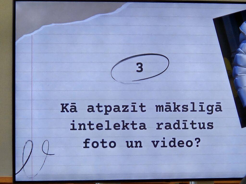 Krāpnieki savu noziedzīgo mērķu īstenošanai bieži izmanto mākslīgo intelektu. Skolēni nodarbības laikā tika informēti, kā virtuālajā telpā var atšķirt mākslīgā intelekta radītu informācijas saturu, kas kļūst aizvien rafinētāks, un kur vērsties pēc palīdzības krāpniecības gadījumā.
