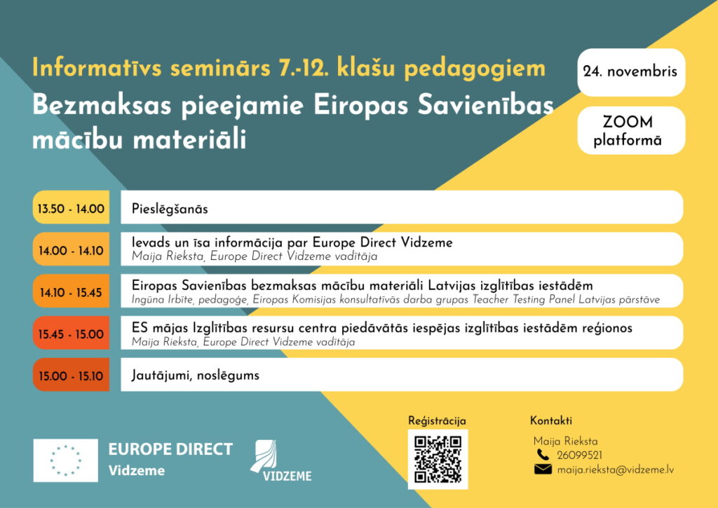 24. novembrī Latvijas izglītības iestāžu pedagogus aicina pievienoties “EUROPE DIRECT” Vidzeme organizētajam pasākumam “Bezmaksas pieejamie Eiropas Savienības mācību materiāli”.