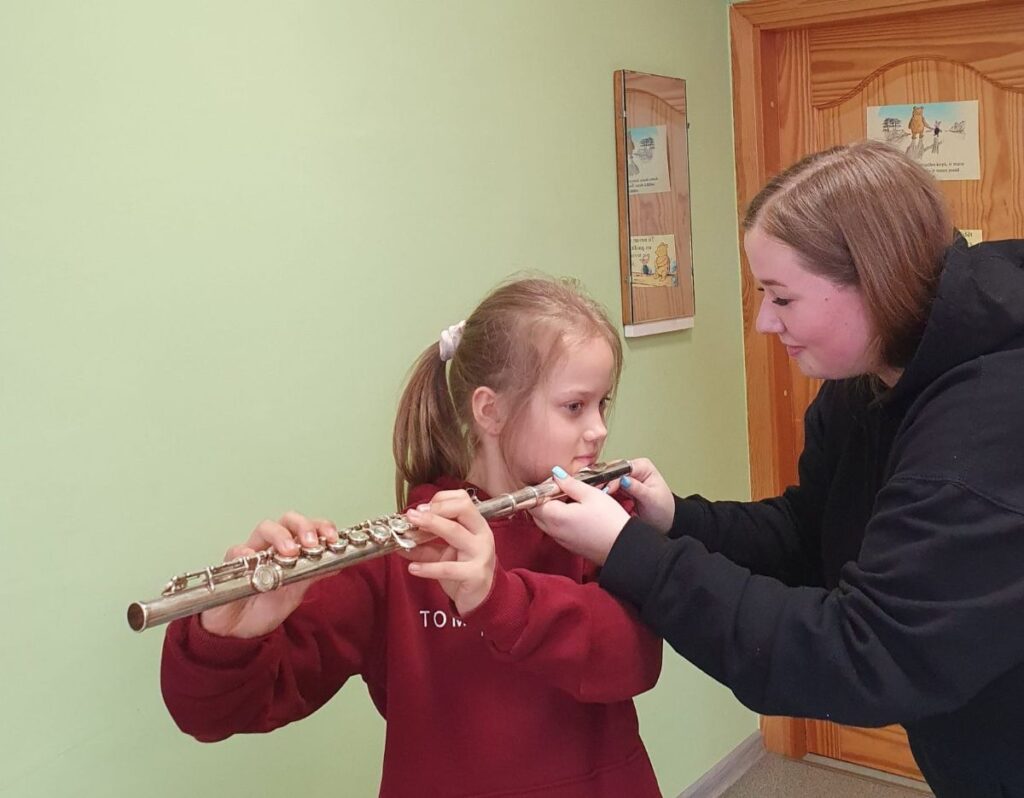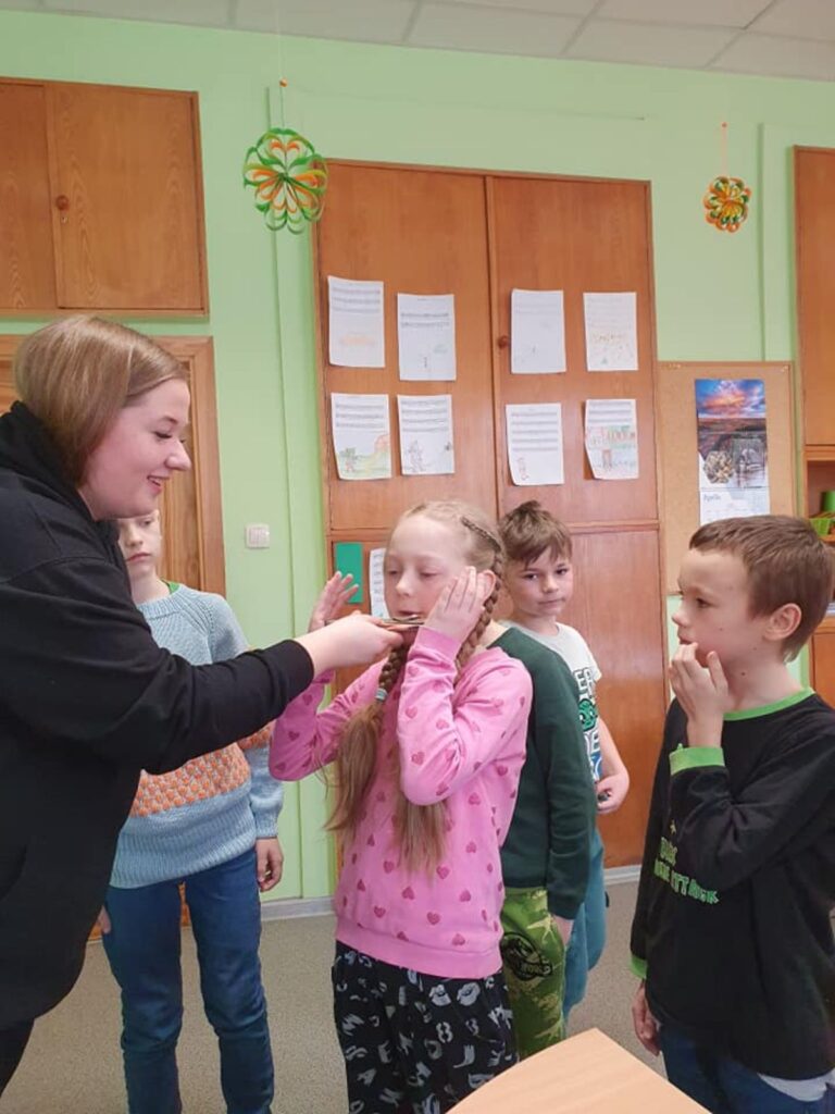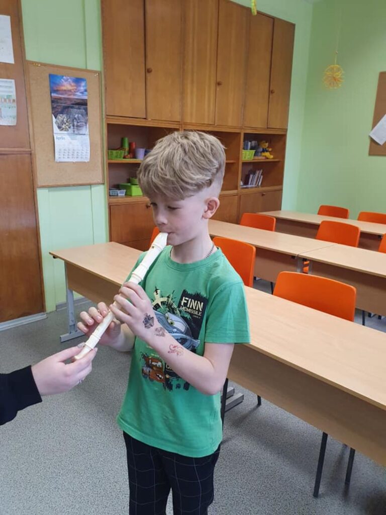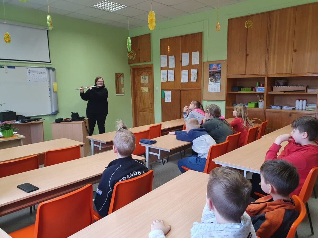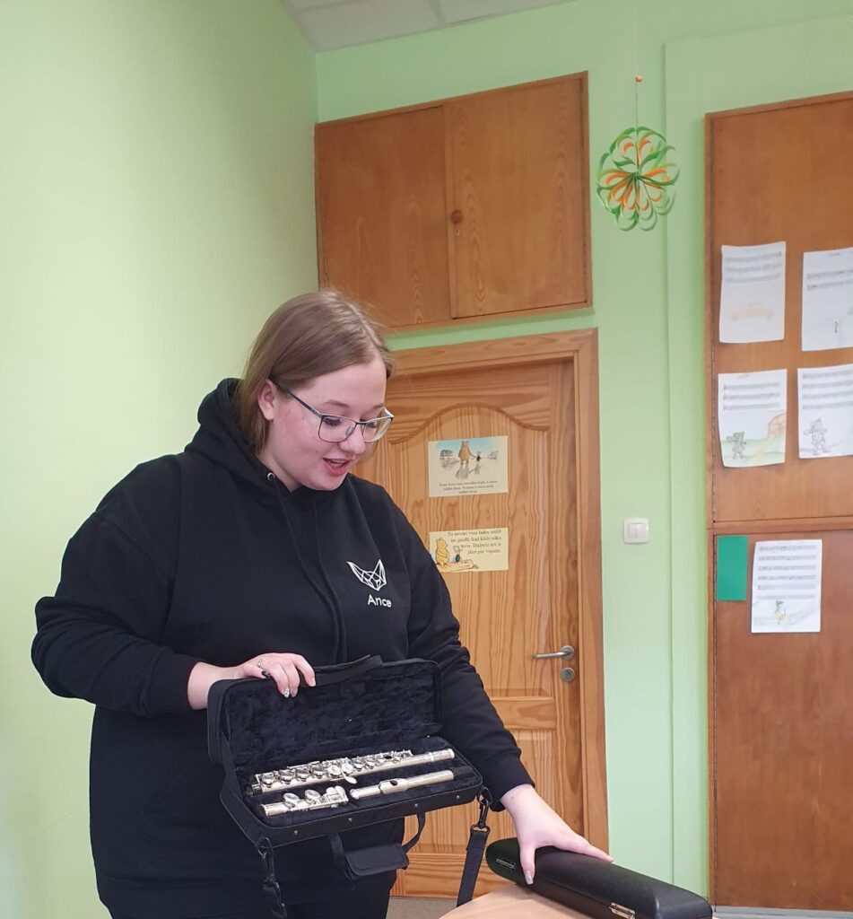 Ance skolēnus iepazīstināja ar mūzikas instrumentiem, kurus pati spēlē ikdienā. Tie bija – blokflauta, pikolo flauta, orķestra flauta un ukulele. Viņa stāstīja par instrumentu vēsturi, no kā tie gatavoti, demonstrēja kā skan, stāstīja savu pieredzi tos apgūstot, rādīja dažādus vingrinājumus elpas trenēšanai un pirkstu veiklībai. Visi kopīgi nodziedāja dažas latviešu tautasdziesmas. Skolēniem bija iespēja arī pašiem iepūst blokflautā un orķestra flautā.