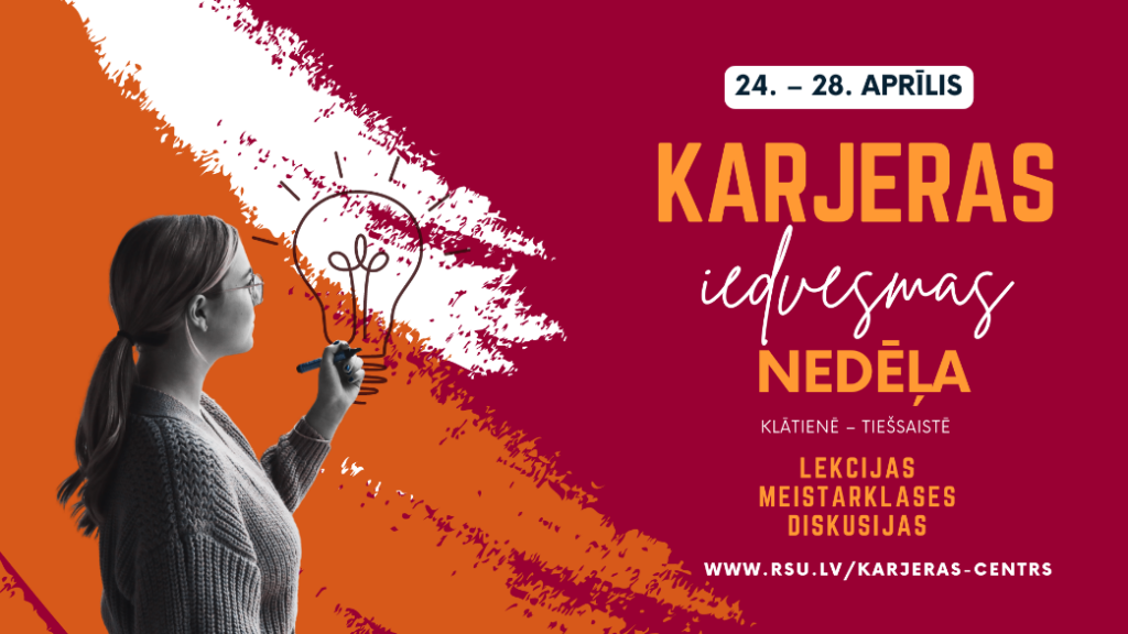 Trešdien, 26. aprīlī, plkst. 16.15-17.15 ar praktiskiem padomiem karjeras plānošanā dalīsies “ASTRAL Executive Search” vecākā konsultante Ilze Sila. Kas jādara, lai pēc iespējas veiksmīgāk iekļautos darba tirgū un atrastu sev piemērotāko darba vietu? Kādas kļūdas nepieļaut, gatavojot CV, piedaloties intervijās vai uzrunājot potenciālos darba devējus? Par šo ikviens aicināts diskutēt klātienes lekcijā RSU Senāta zālē, Dzirciema ielā 16. Tikmēr plkst. 17.00-18.00 tiešsaistē “Zoom” platformā psiholoģes Lauras Freimanes vadībā ritēs meistarklase “Esi savas karjeras režisors”. Meistarklasē tiks piedāvāta radoša metode, kas palīdzēs apzināties karjeras mērķus un sapņus, savas stiprās puses, iespējamās grūtības un konkrētus soļus, ko spert ceļā uz izaugsmi.