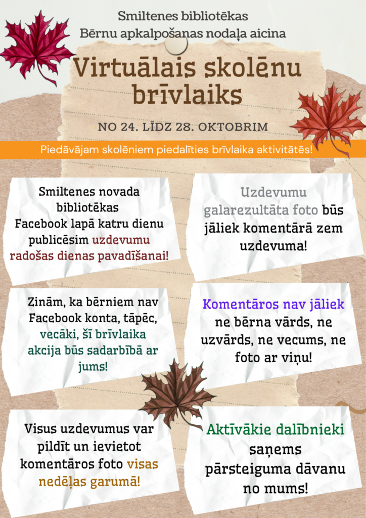 Smiltenes bibliotēkas Bērnu apkalpošanas nodaļa skolēnu rudens brīvlaika nedēļā no 24. līdz 28.oktobrim piedāvās bērniem un pusaudžiem piedalīties “Virtuālajā skolēnu brīvlaikā”.