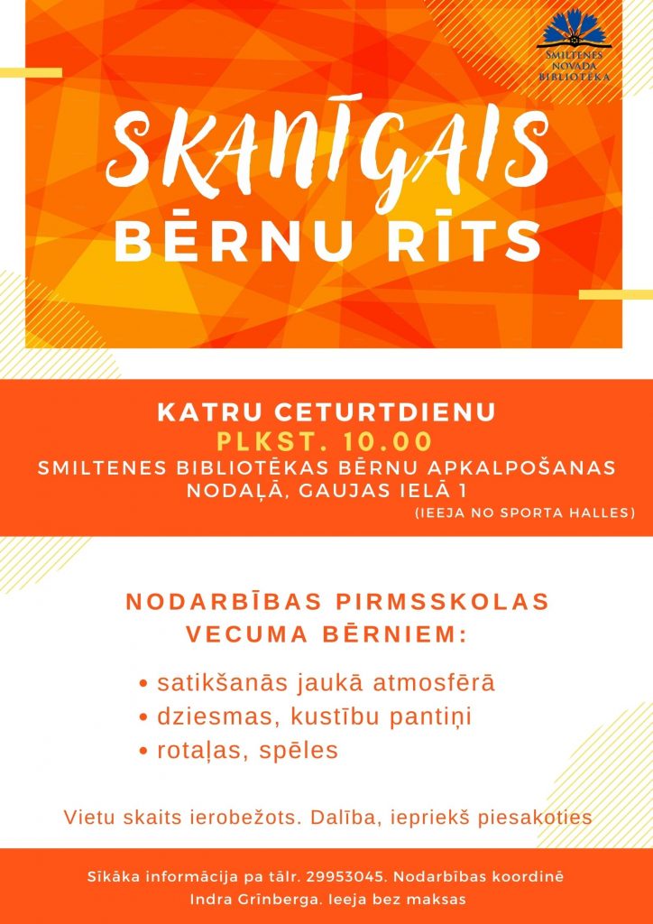 “Skanīgajā bērnu rītā” piedalās māmiņas vai tēti ar pirmskolas vecuma bērniem. Šajās nodarbībās brīvā un jaukā atmosfērā tiek dziedātas dziesmiņas un izspēlēti kustību pantiņi kopā ar bērniem. Tāpat bērniem ir iespēja rotaļāties ar attīstošajām rotaļlietām gan vieniem pašiem, gan kopā ar vienaudžiem. Savukārt māmiņām un tētiem šī ir iespēja satikties, sarunāties, sniegt atbalstu, darboties un kvalitatīvi pavadīt laiku kopā ar savu bērnu.