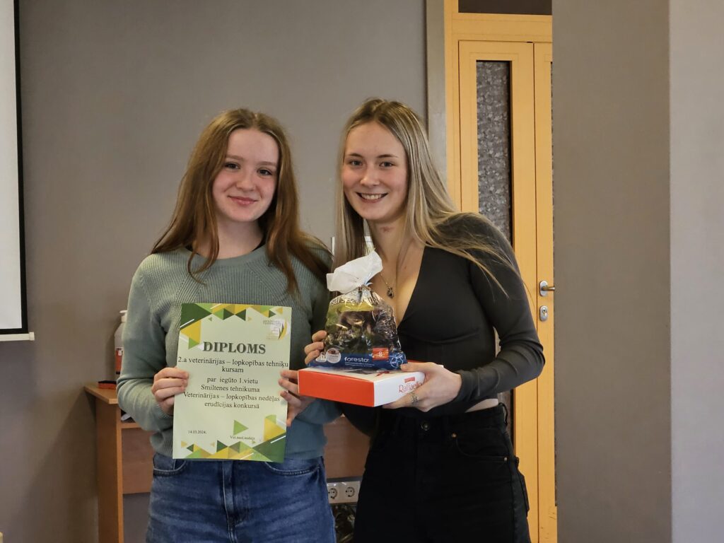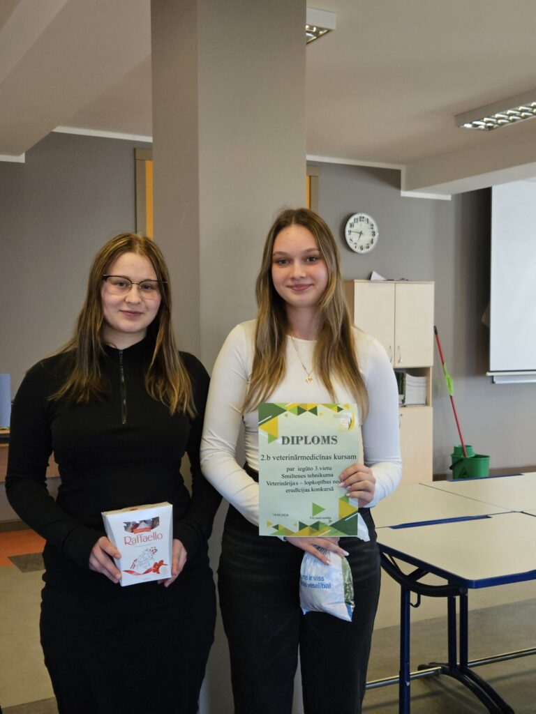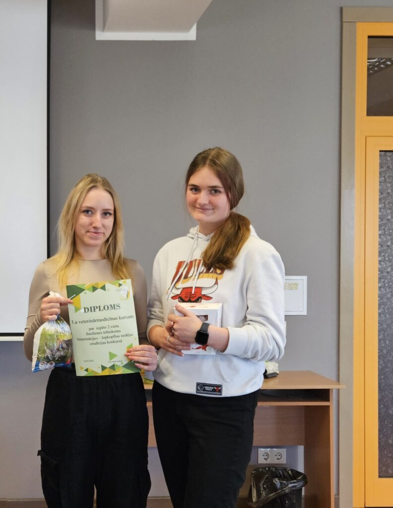 4.vieta – 1.a veterinārārsta asistentu – lopkopības tehniķu kursa komandai: Evelīnai Uvai Strēlniecei un Martai Marijai Preimenei.