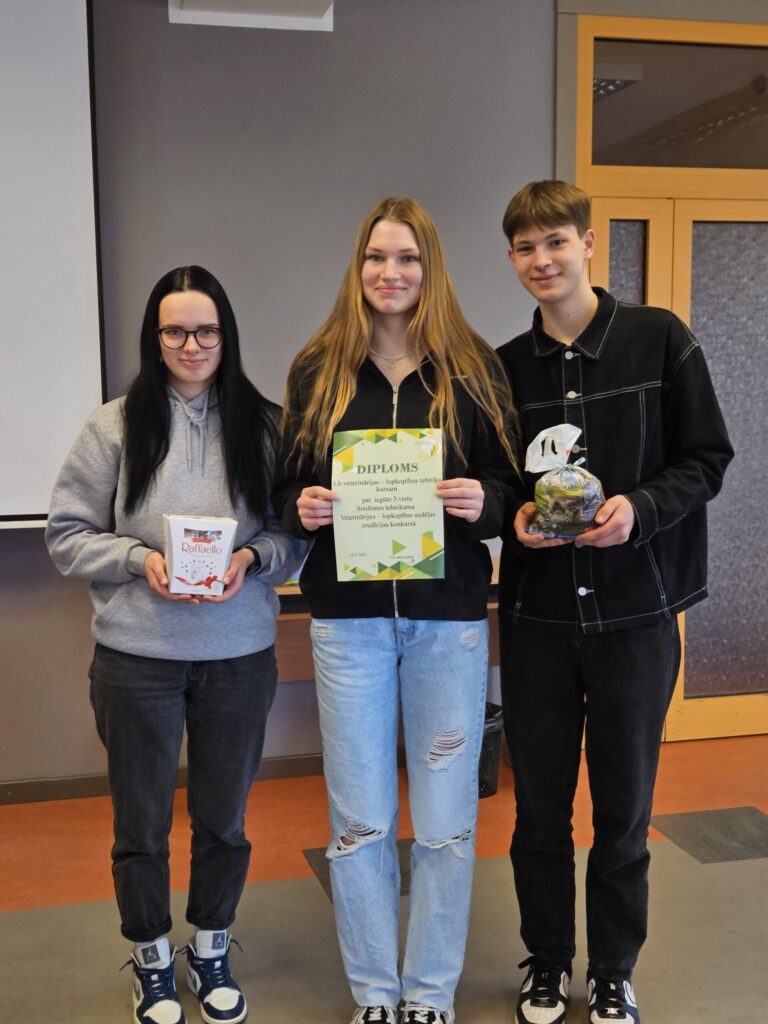 2.vietu nopelnīja 3. a veterinārārsta asistentu kursa audzēknes Amanda Marjuniča, Anita Kūde un Beāte Andersone, bet 3.vietu ar vienādu punktu skaitu nopelnīja 2. b veterinārārsta asistentu kursa komanda: Linda Grabovska, Beāte Laicāne, Roberta Rozenberga un 3.b veterinārārsta asistentu -lopkopības tehniķu kursa komanda: Elīza Bērziņa, Paula Upmane un Valdis Golubevs.
