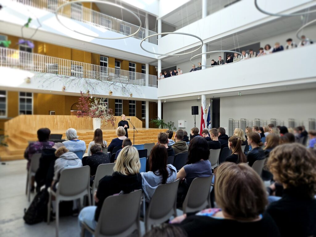 “1990.gada 4.maijā mēs atguvām savu neatkarību, lai dzīvotu brīvā, tiesiskā un demokrātiskā valstī,” klātesošos uzrunāja direktore Inguna Kondratjeva. “Mēs varam priecāties, ka Latvija šodien ir brīva, ka mums ir mierīgas debesis, ka mums tiek piedāvāts tik daudz un plašu iespēju, kas mums, protams, ir jāizmanto. Brīvība dod iespēju piepildīt sapņus un mērķus, bet brīvība arī uzliek atbildību par savu rīcību, izvēlēm, dzīvi un valsti.